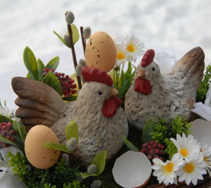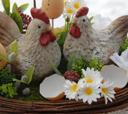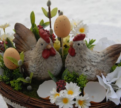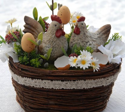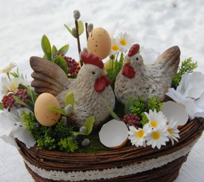Velká dekorace je naaranžována v krásném přírodním proutěném koši.....keramický kohout se slepičkou, dokonalé umělé květiny, umělá vejce