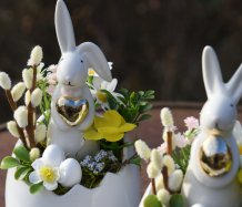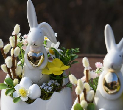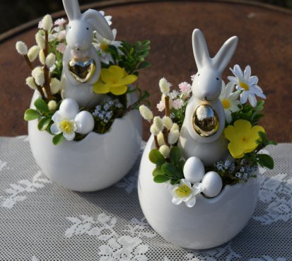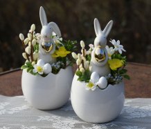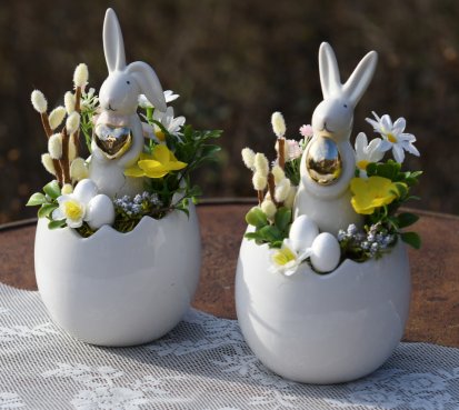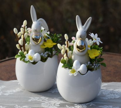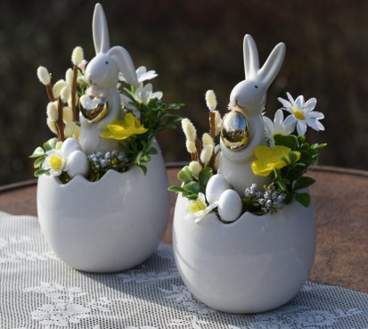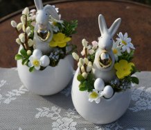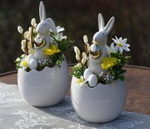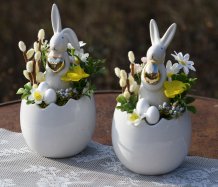 Krásný keramický zajíček je naaranžován do bílé keramické skořápky...květiny jsou umělé, ale dokonalé