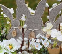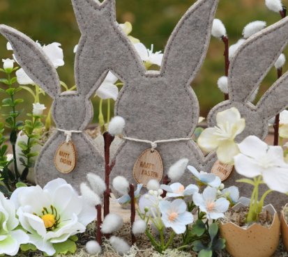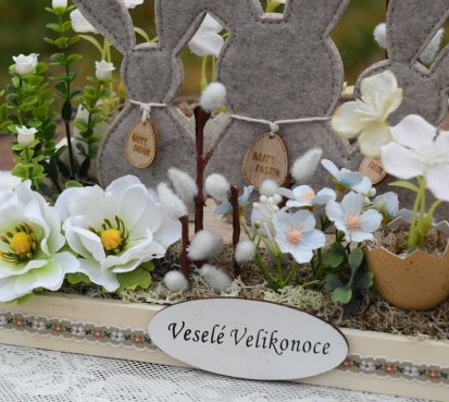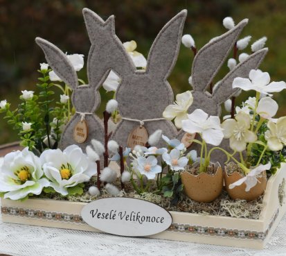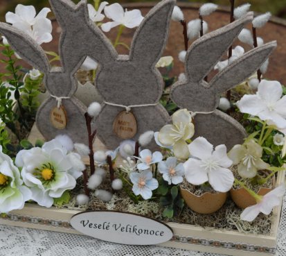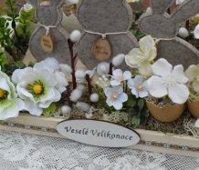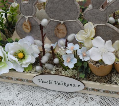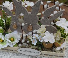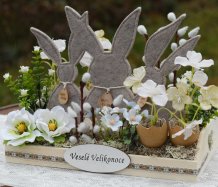 Dekorace je naaranžována do dřevěné bedničky, bohatě zdobena dokonalými umělými květinami, umělými skořápkami....3 krásní ušáčci k tomu