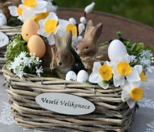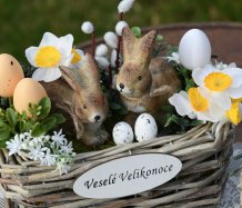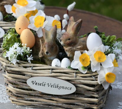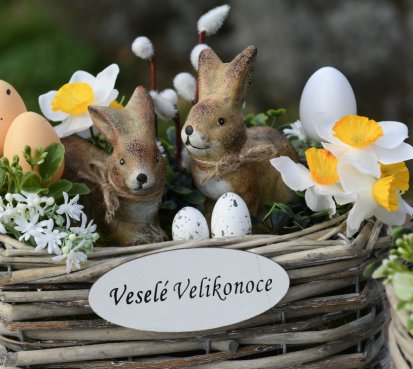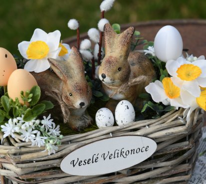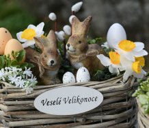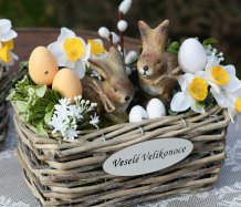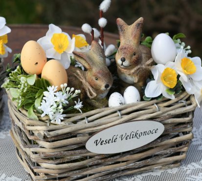 Krásný proutěný košík je naaranžován dokonalými umělými květinami....dva rozkošní ušáčci k tomu