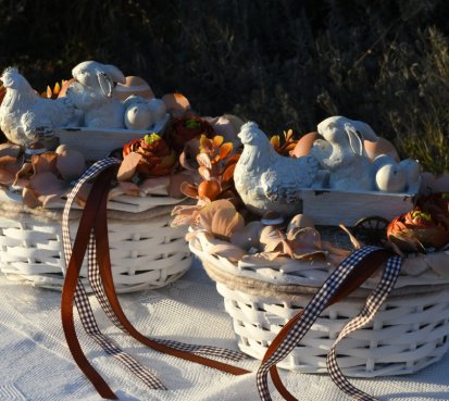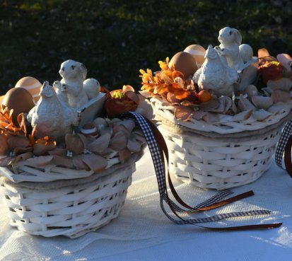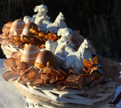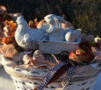 Proutěný košík je nadekorován roztomilou slepičkou se zajíčkem....dokonalé umělé květiny, vajíčka