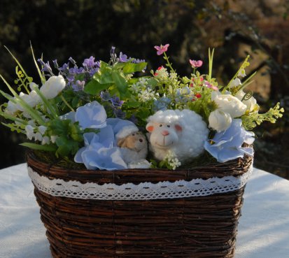 Krásný proutěný přírodní košík je bohatě zdoben dokonalými umělými květinami....a veselými ovečkami