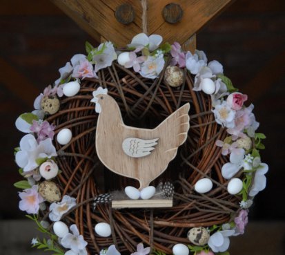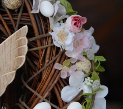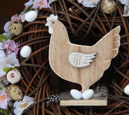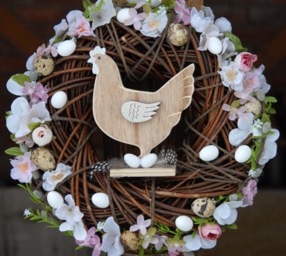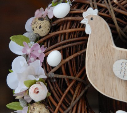 Proutěný korpus je ozdoben dokonalými umělými květinami...na vše dohlíží dřevěná slepička