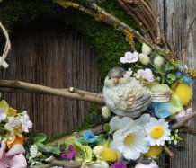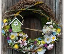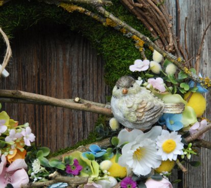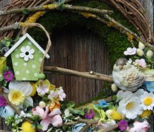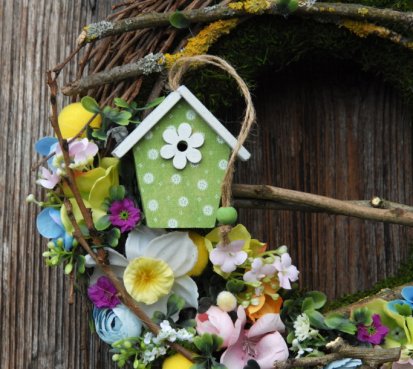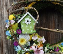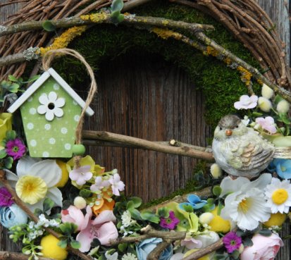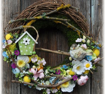 Věnec je vytvořen na pevném mechovém korpusu, zdoben proutky, větvičkami, dokonalými umělými květinami, dřevěnou budkou.....a roztomilý ptáček k tomu