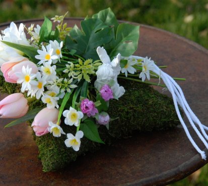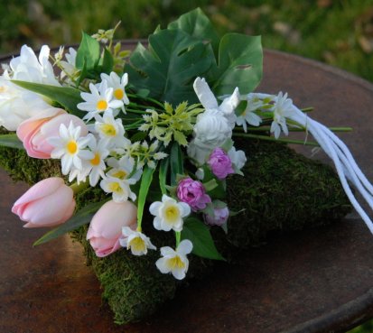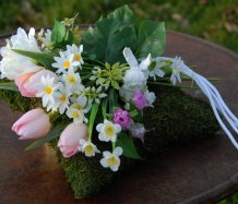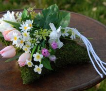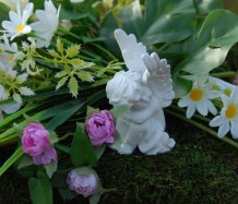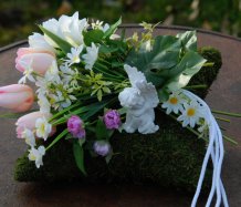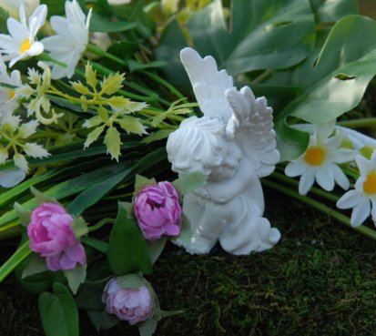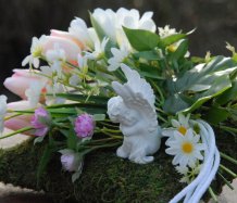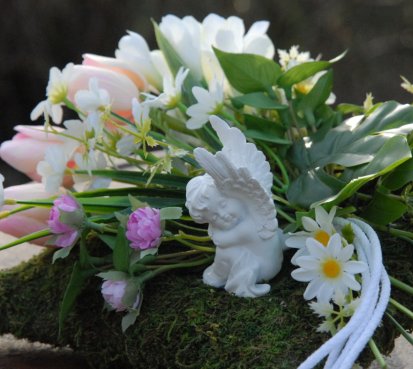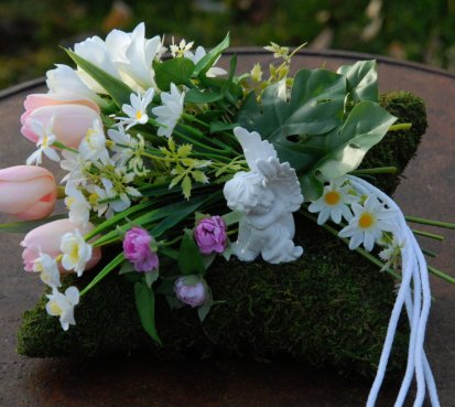 Mechový polštář je bohatě zdoben dokonalými umělými květinami...roztomilý andělíček k tomu