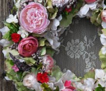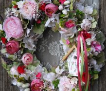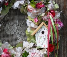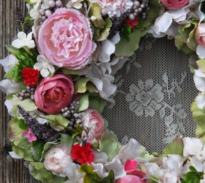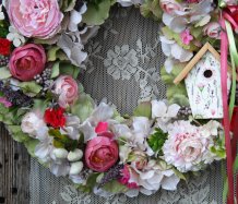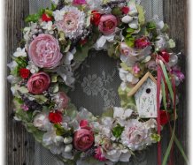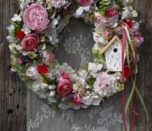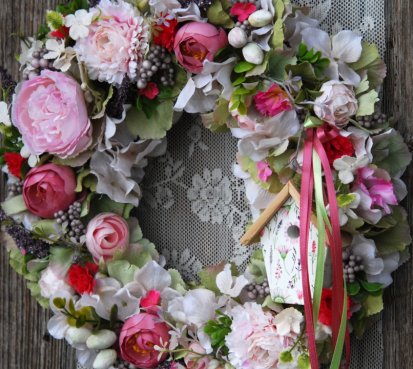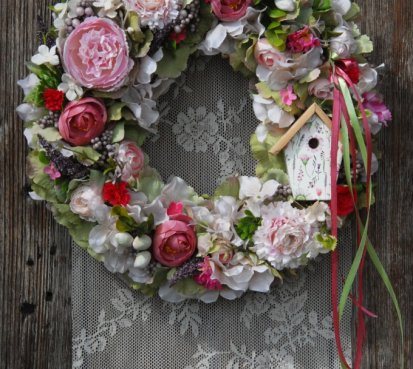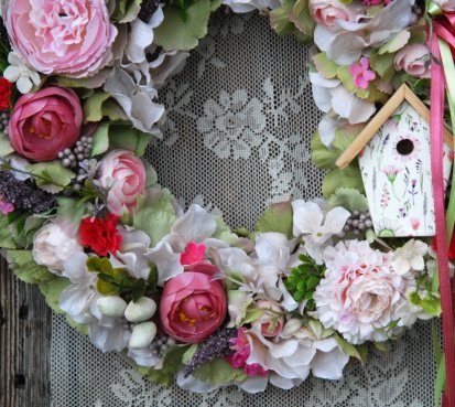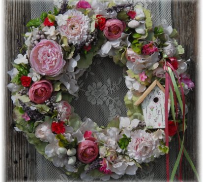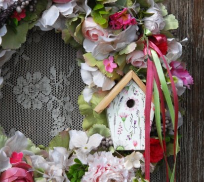 Velký věnec je vytvořen na pevném korpusu, nazdoben dokonalými umělými květinami....krásná dřevěná budka k tomu
