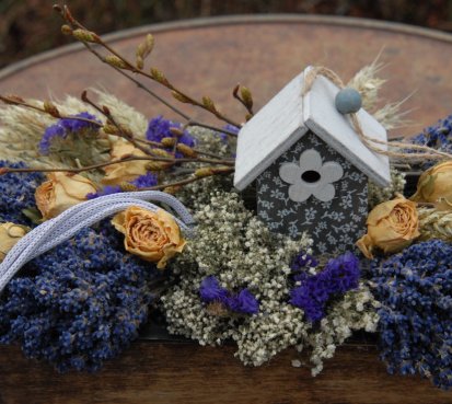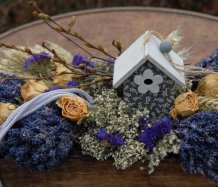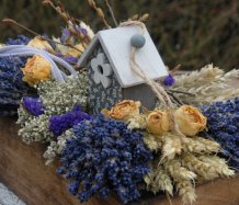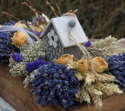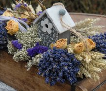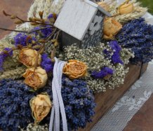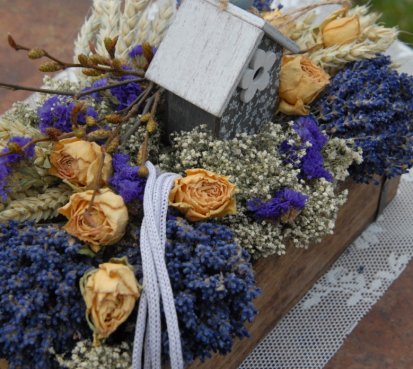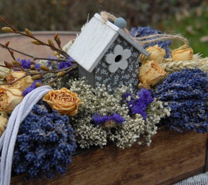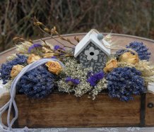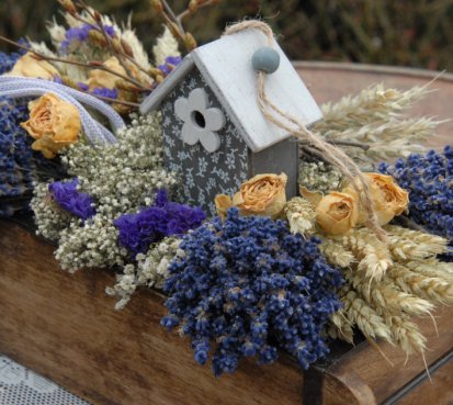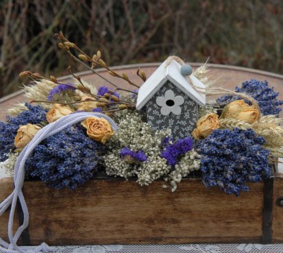 Krásná rustikální bedýnka je naplněna voňavou sušenou levandulí, obilím, růžičkami .....a dřevěným domečkem