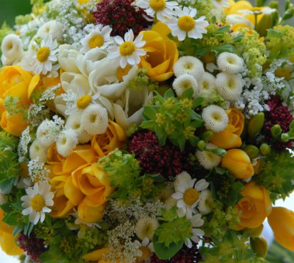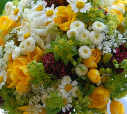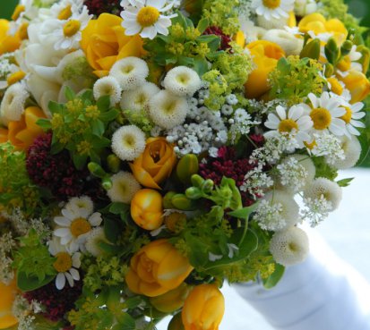 Svatební kytice z čerstvých frézií, mavuně, kontryhelu....