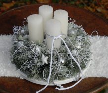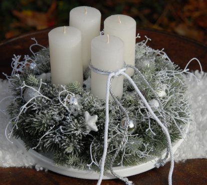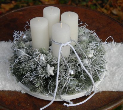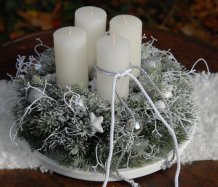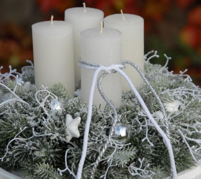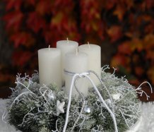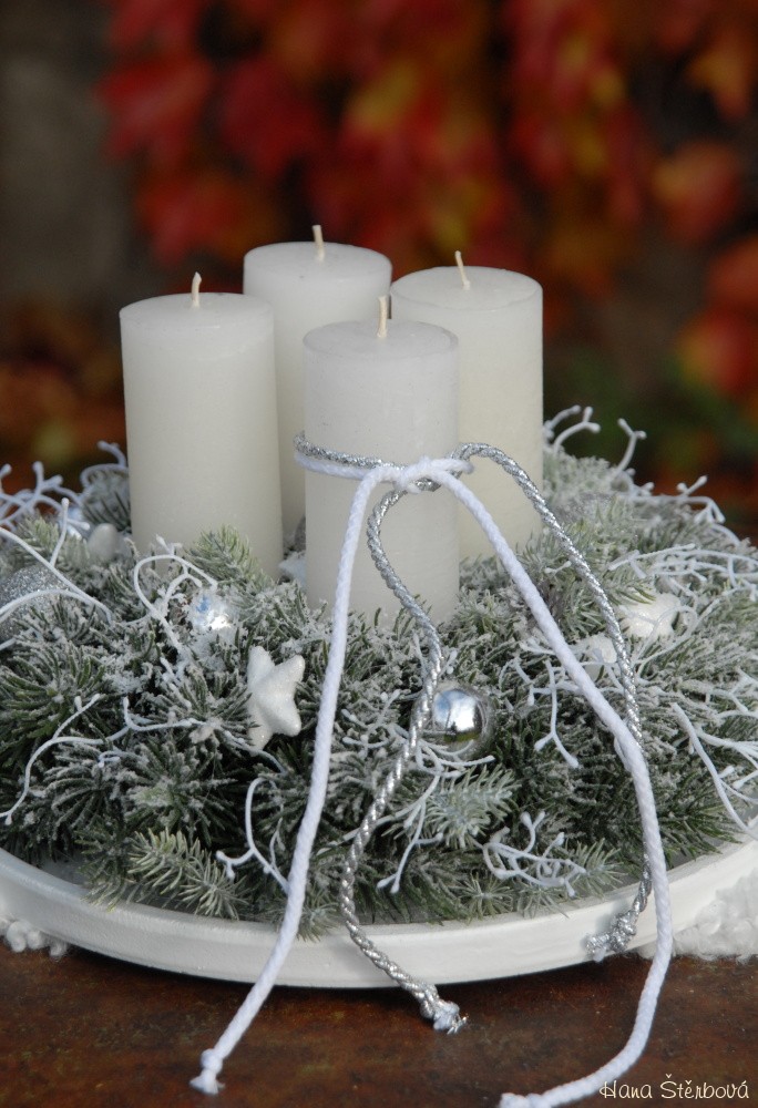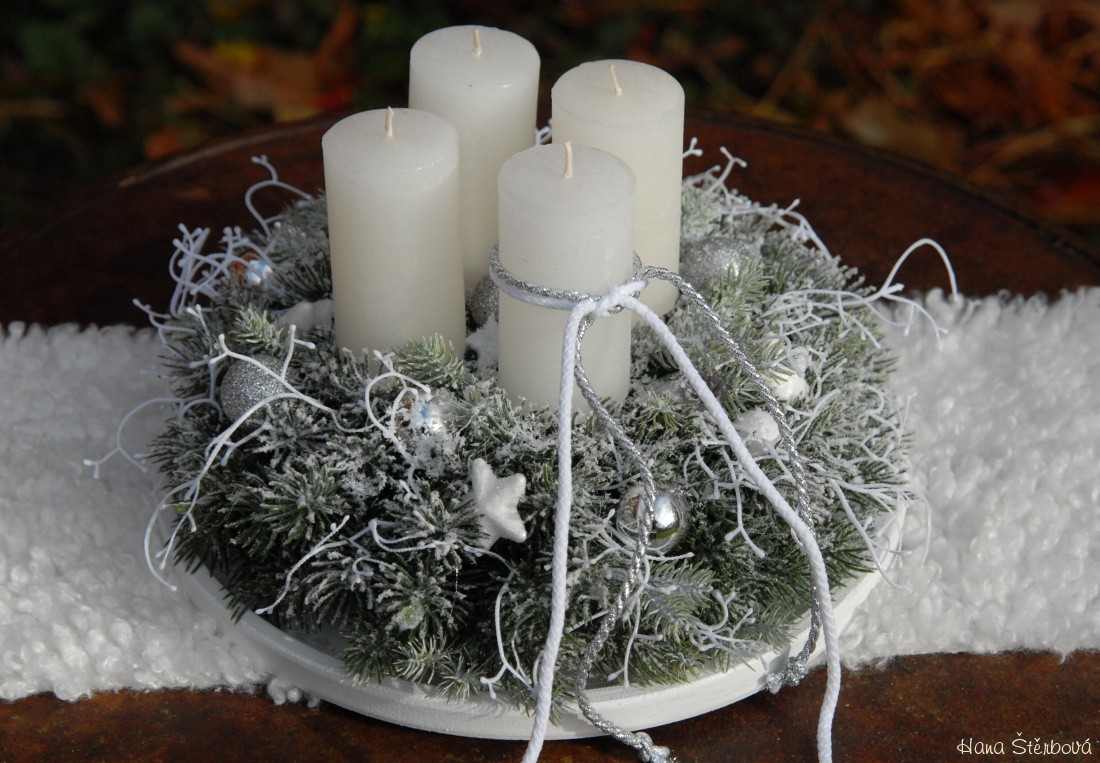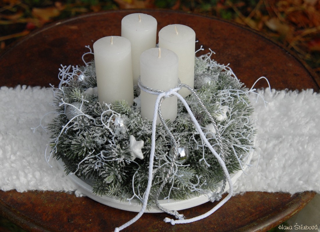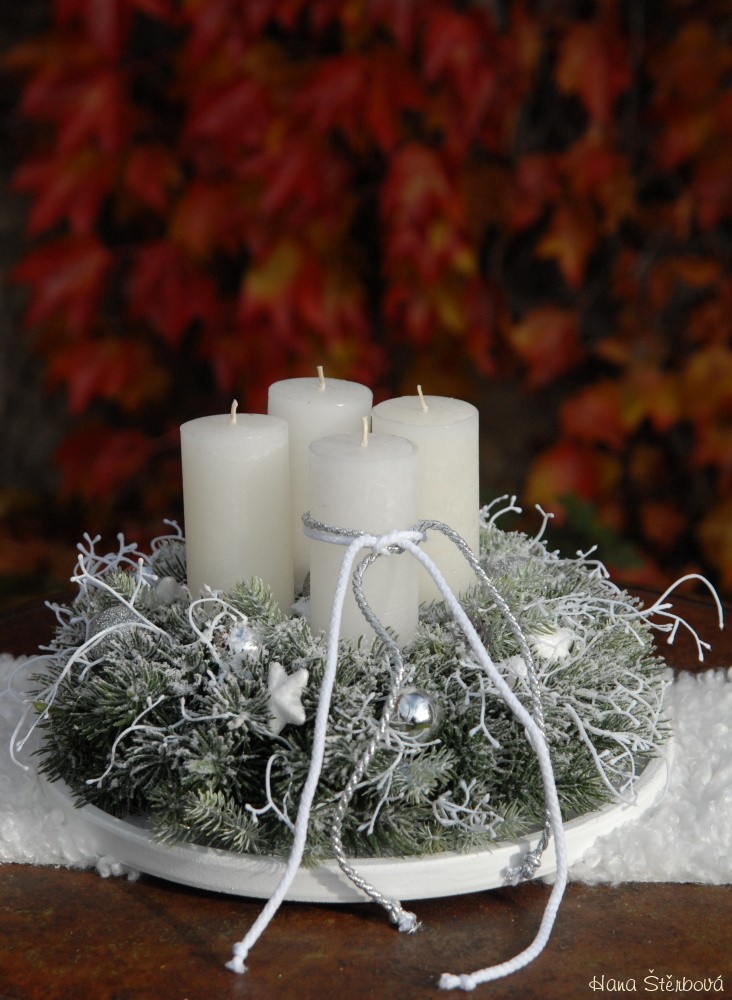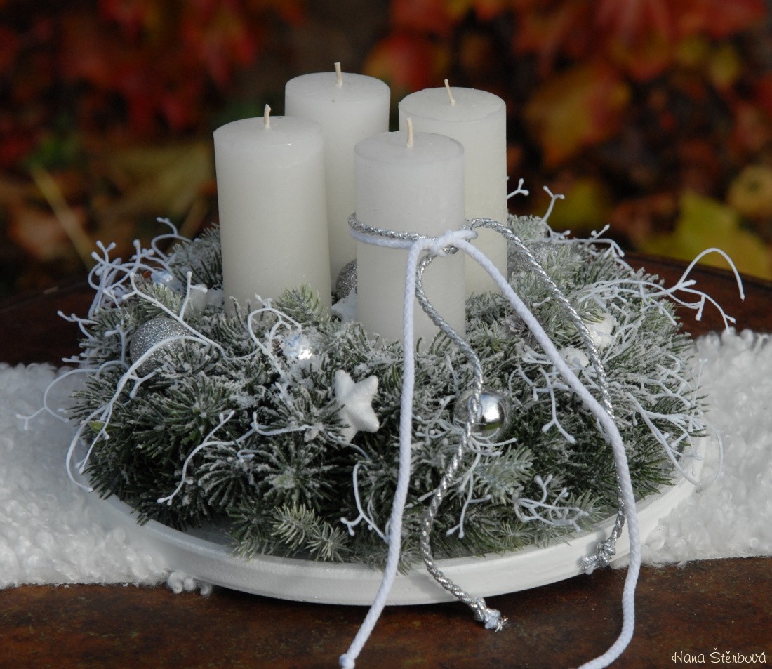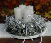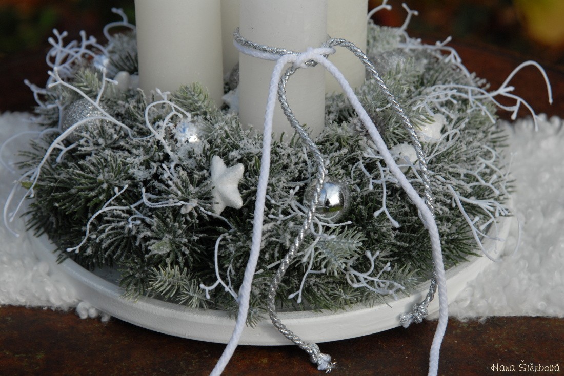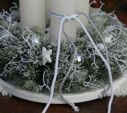 Mohutná dekorace z krásného umělého zasněženého jehličí s vánočními přízdobami na dřevěném podnosu