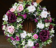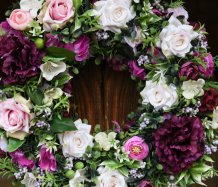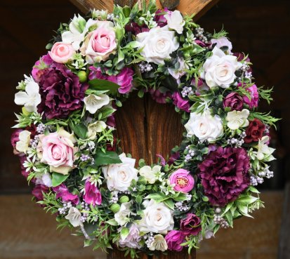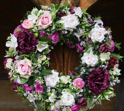 Velký luxusní věnec je bohatě zdoben dokonalými umělými květinami