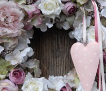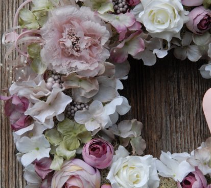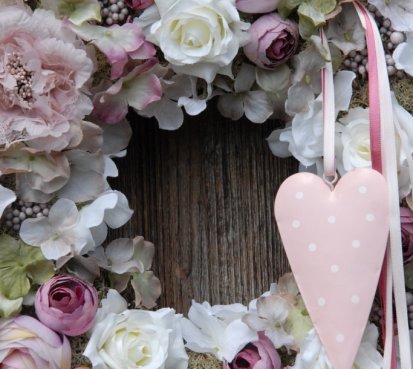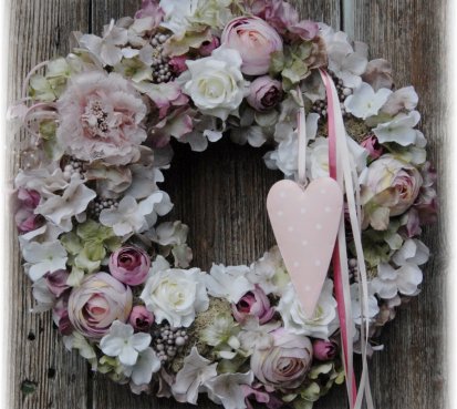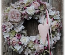 Veliký luxusní věnec s dokonalými látkovými květinami na pevném korpusu.....plechové srdíčko k tomu