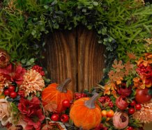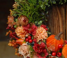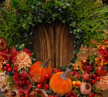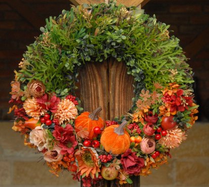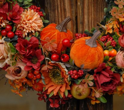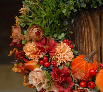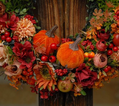 Bohatě zdobený velikánský věnec umělými květinami a plody