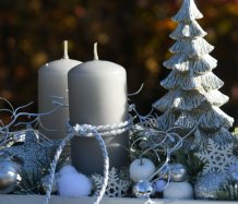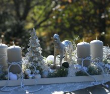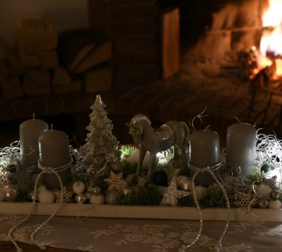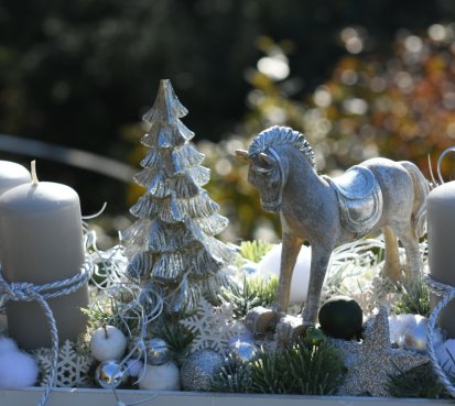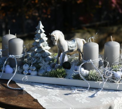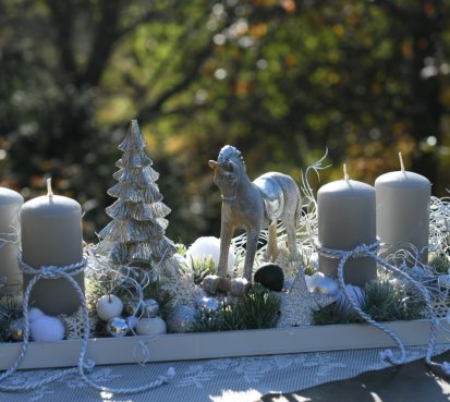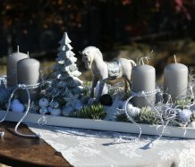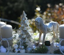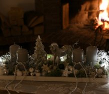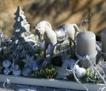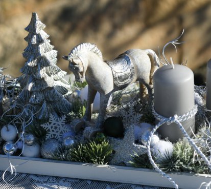 Velká luxusní dekorace je naaranžována na dřevěném podnosu, ozdobena velkým množstvím vánočních přízdob, vyměnitelné svíčky jsou na bezpečnostních bodcích. Krásný koník a stromeček jsou z polyresinu. Dekorace je podsvícena led světýlky