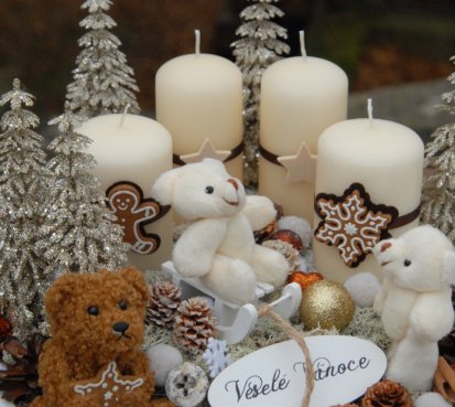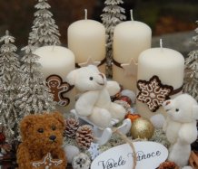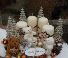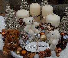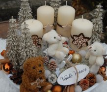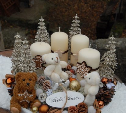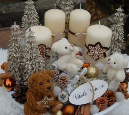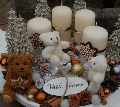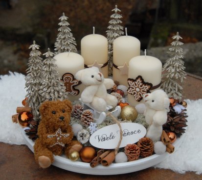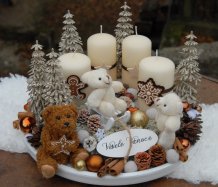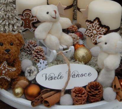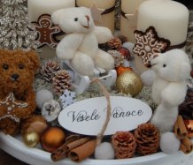 Bohatě zdobená luxusní dekorace vánočními přízdobami na dřevěném podnosu...krásní medvídci k tomu