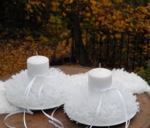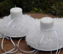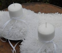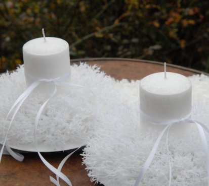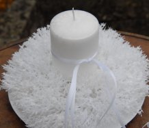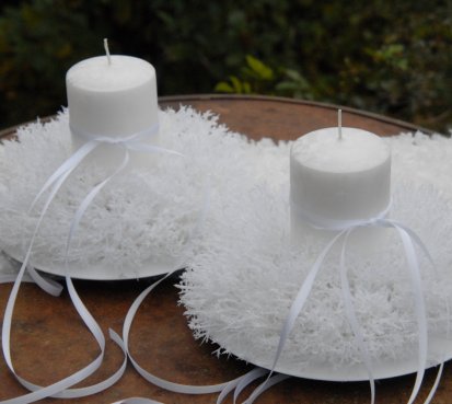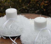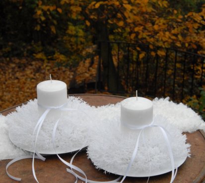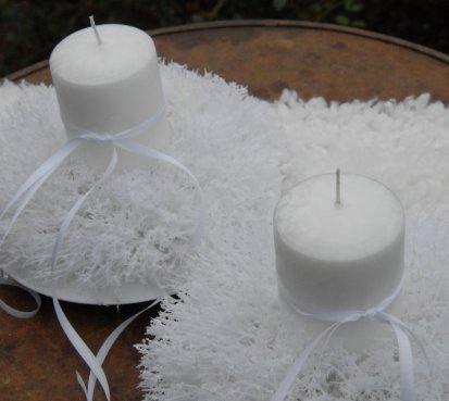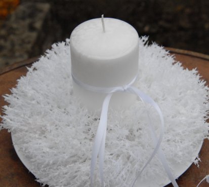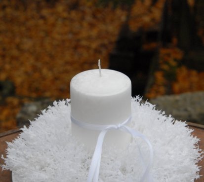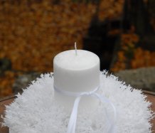 Luxusní svíčka na bezpečnostním bodci je vyměnitelná a je umístěna do zasněženého věnce na bílém plastovém talíři