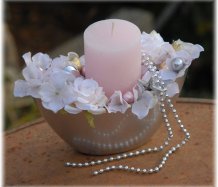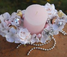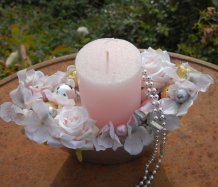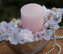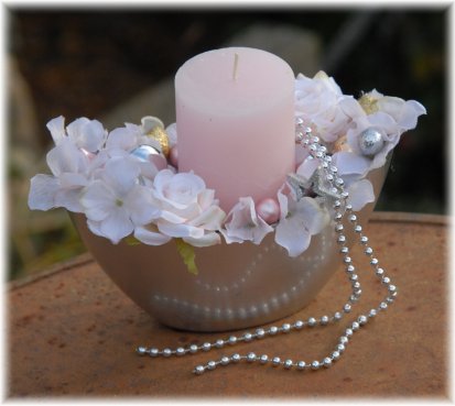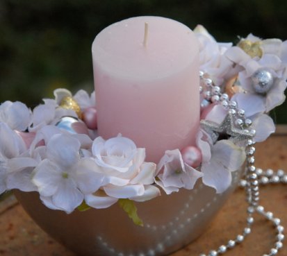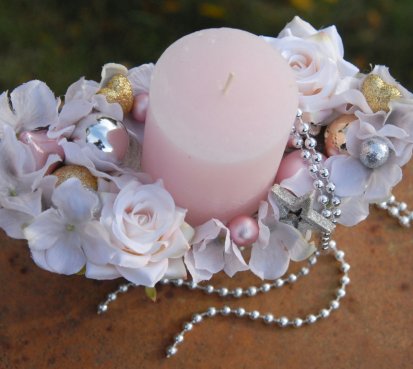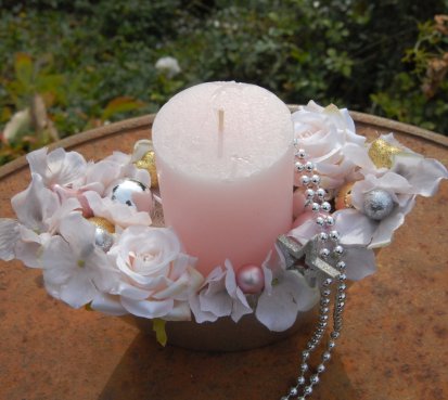 Svícen je naaranžován do stříbrné nádobky ve tvaru lodičky, bohatě zdoben vánočními přízdobami. Svíčka je vyměnitelná na bezpečnostním bodci