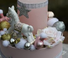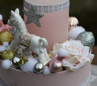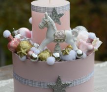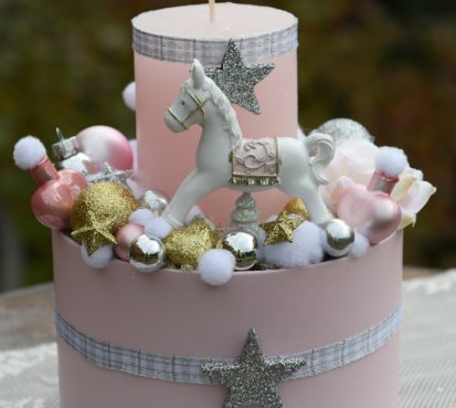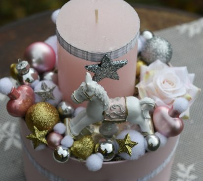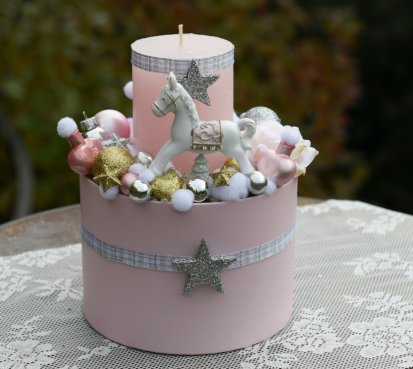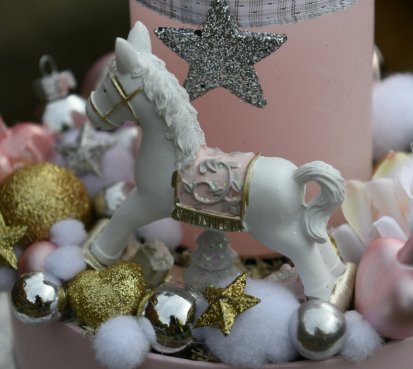 Krásný romantický svícen s vyměnitelnou svíčkou na bezpečnostním bodci, se spoustou vánočních přízdob a koníkem z polyresinu