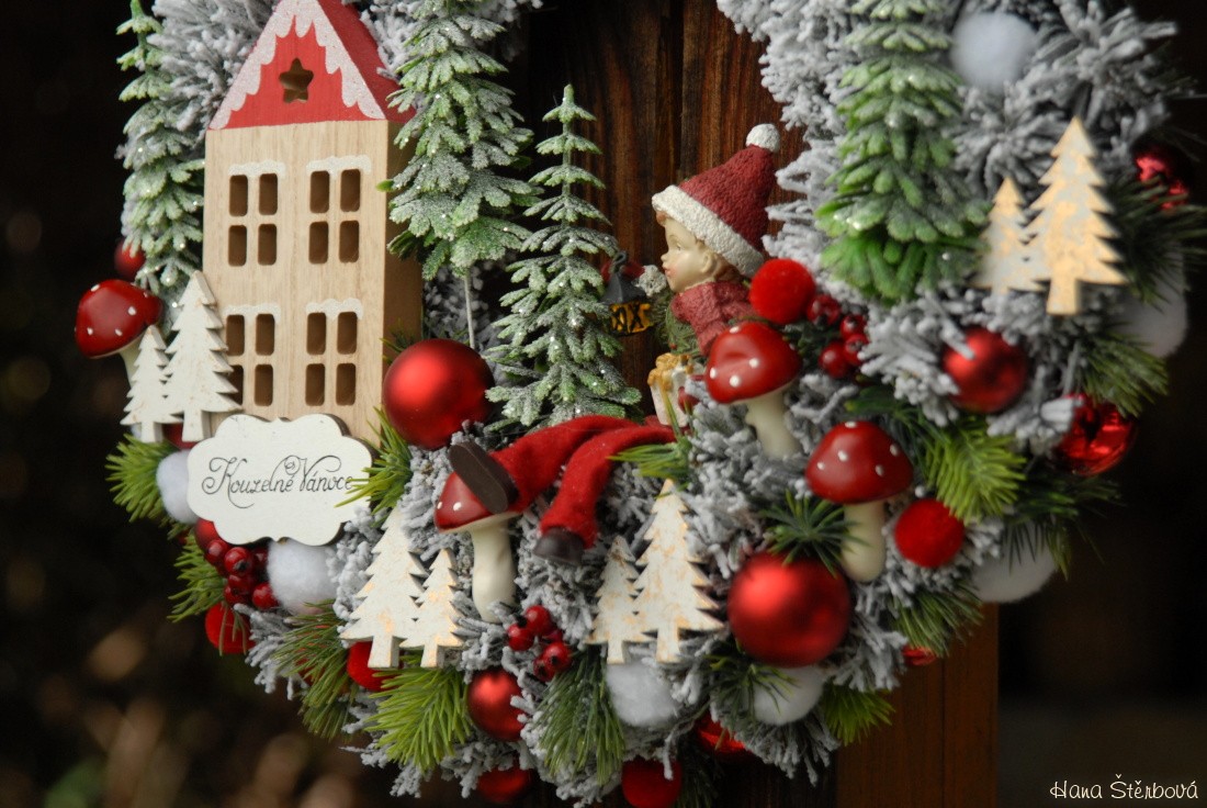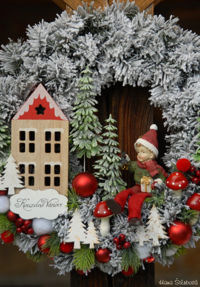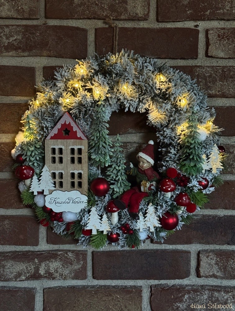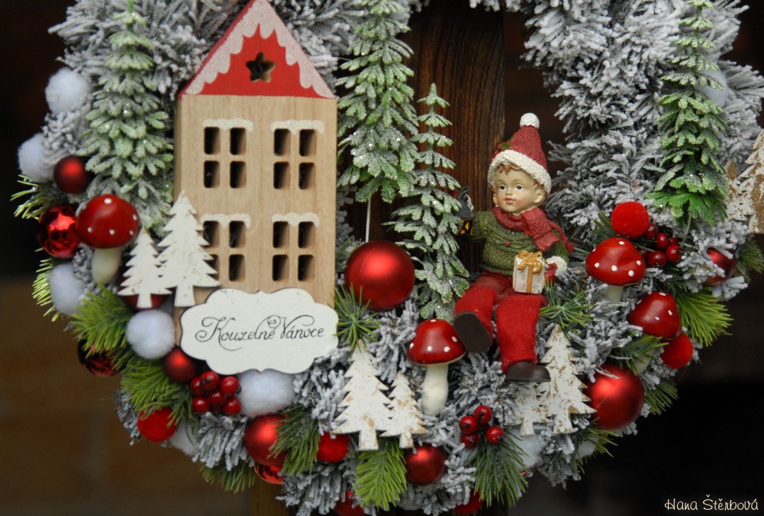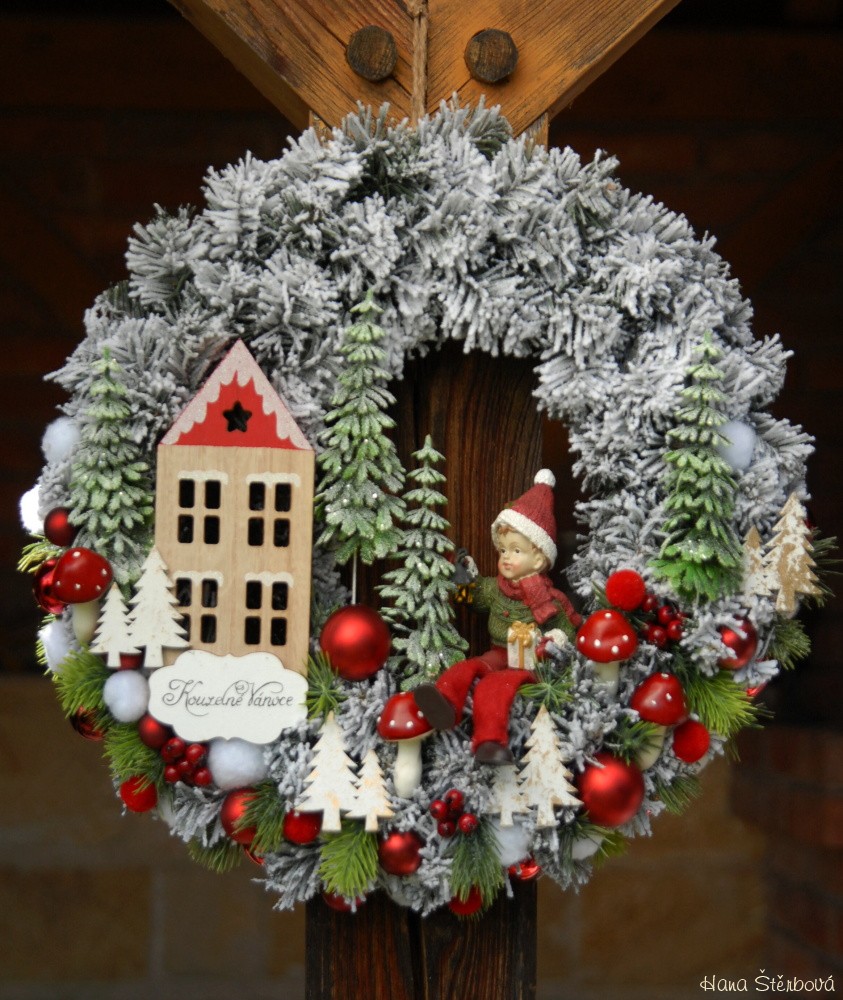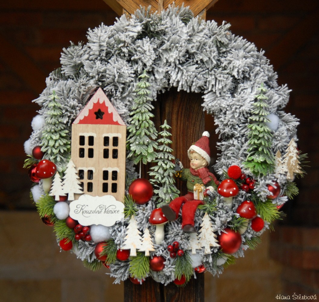 Veliký luxusní věnec z umělého zasněženého jehličí je ozdoben dřevěným domečkem, krásnou figurou z polyresinu, vánočními přízdobami a led světýlky