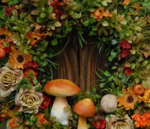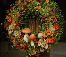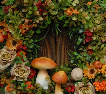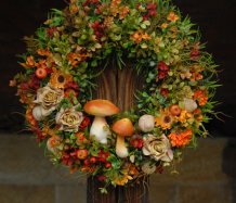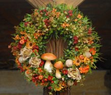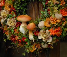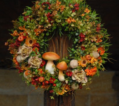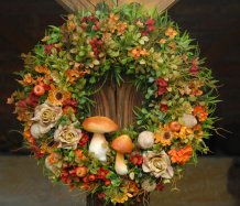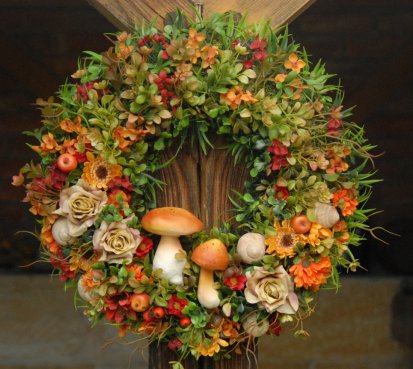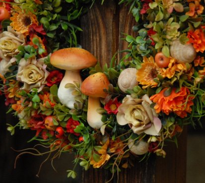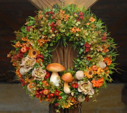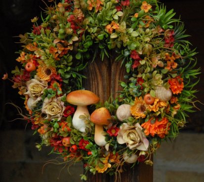 Velikánský bohatě zdobený věnec dokonalými umělými květinami a plody....dokonalé houbičky k tomu