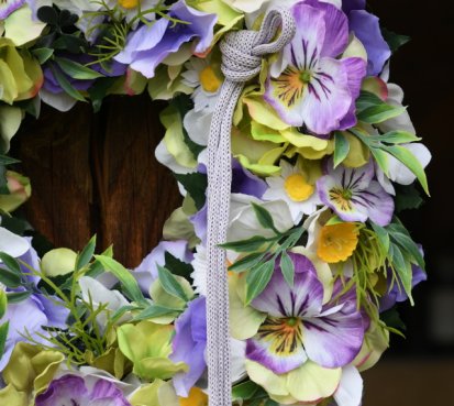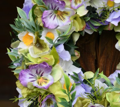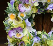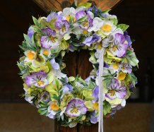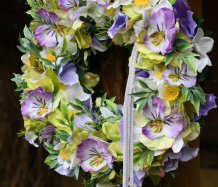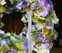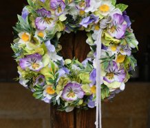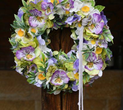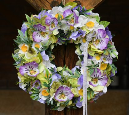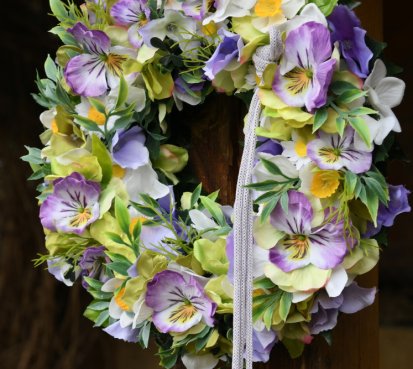 Věnec je vytvořen z dokonalých látkových macešek....a dalších látkových květin