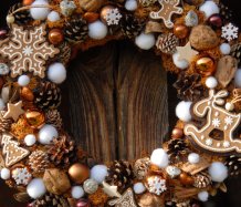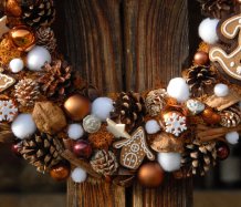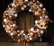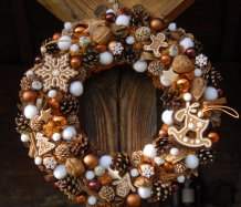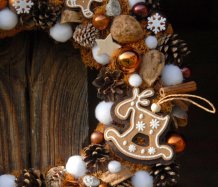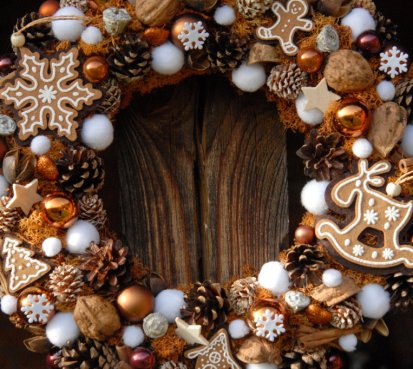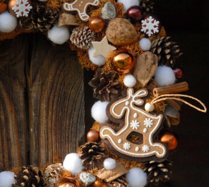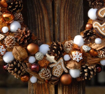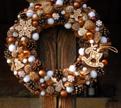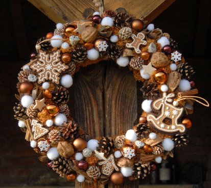 Velký věnec je bohatě zdoben přírodninami, vánočními přízdobami a krásnými perníčky z filcu