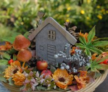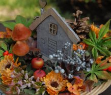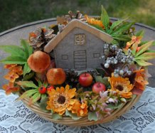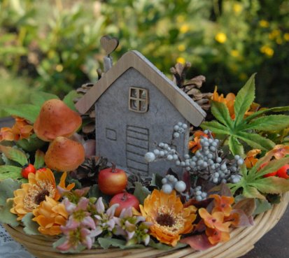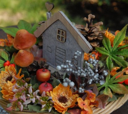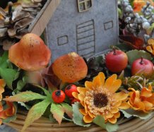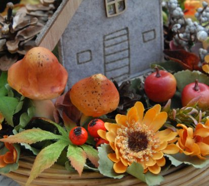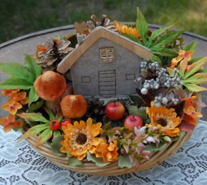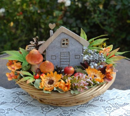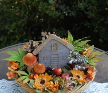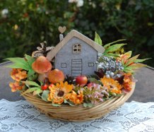 Bohatě zdobený proutěný košík se spoustou dokonalých umělých květin a plodů....krásný domeček k tomu