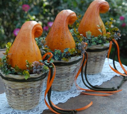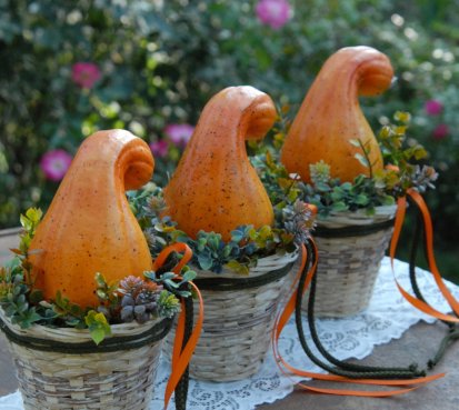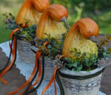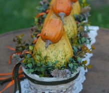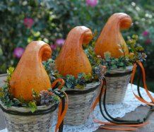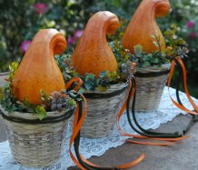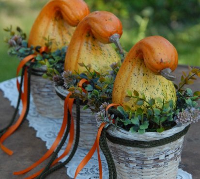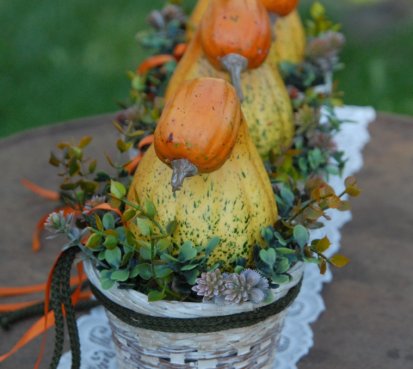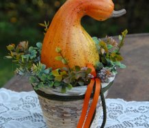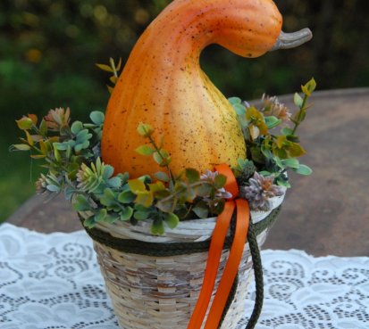 Proutěný košík s dokonalou umělou dýní je nazdoben umělými květinami