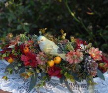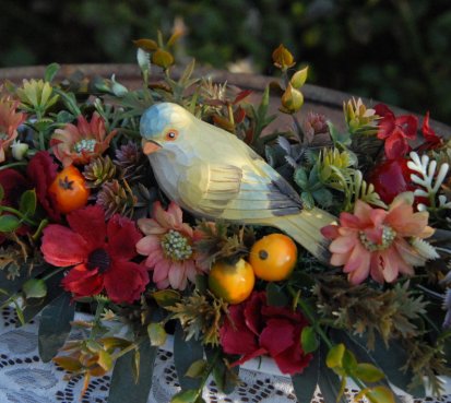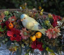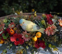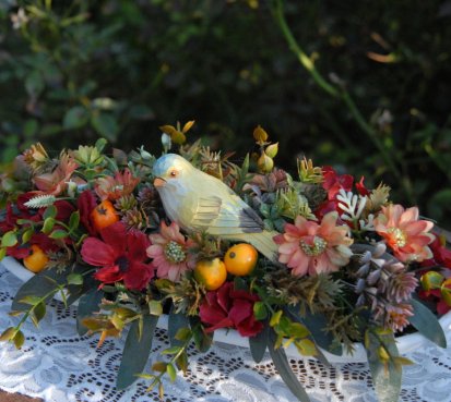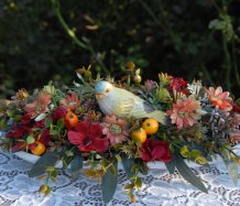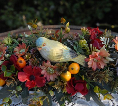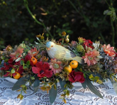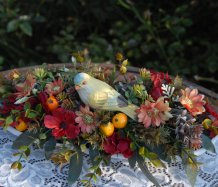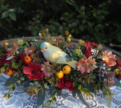 Bohatě zdobená dekorace dokonalými umělými květinami a plody na dřevěném podnosu ....krásný ptáček k tomu