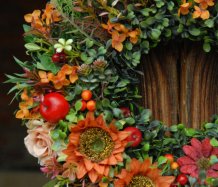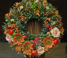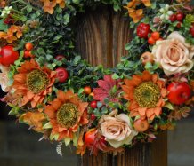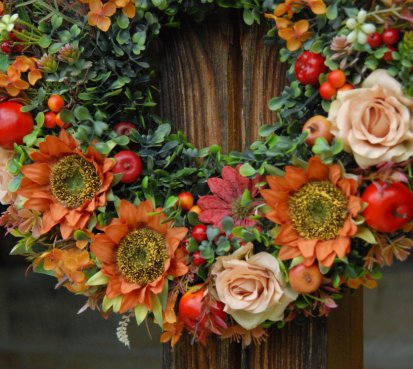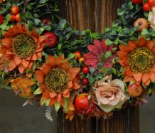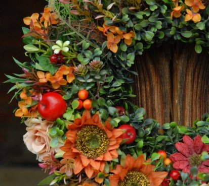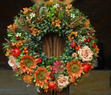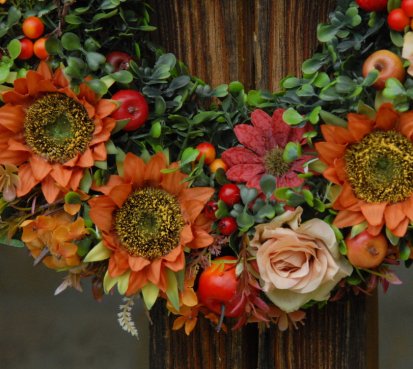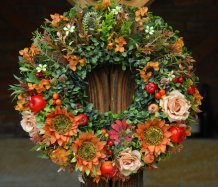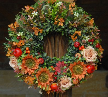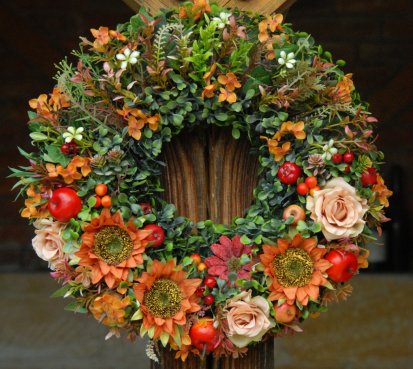 Velký mohutný věnec je vytvořen z dokonalých umělých květin a plodů....
