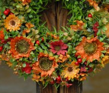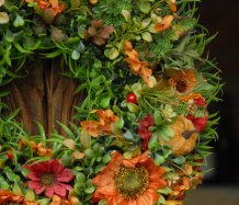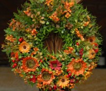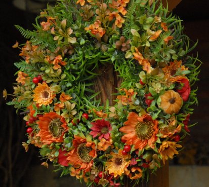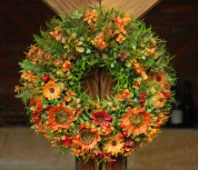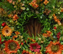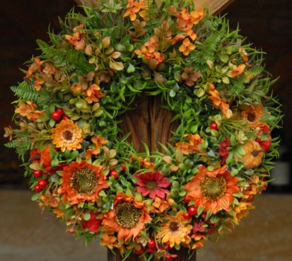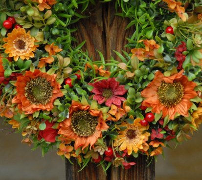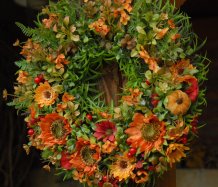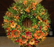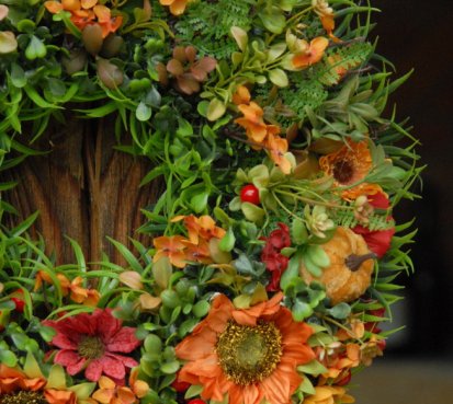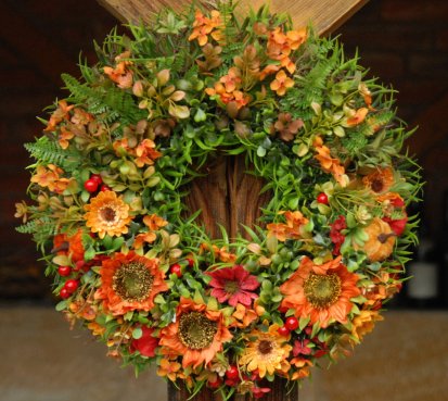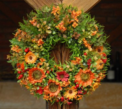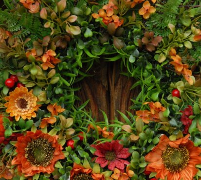 Velký mohutný věnec je vytvořen z dokonalých umělých květin a plodů