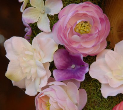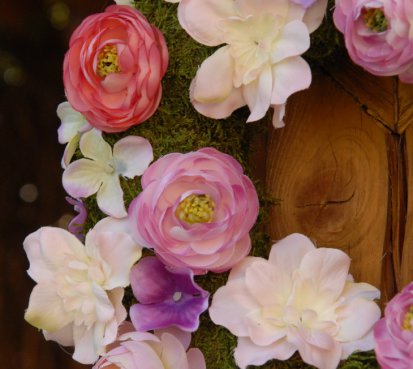 Mechový věnec je ozdoben krásnými látkovými květinami v čele s pryskyřníky, laděn do růžových a fialových tónů.