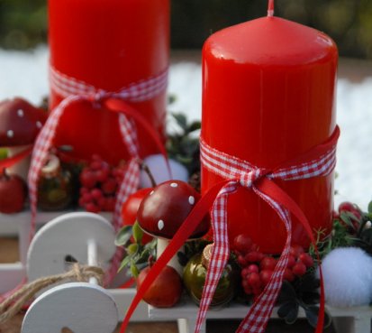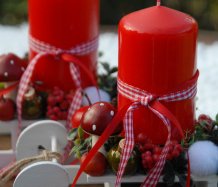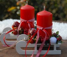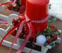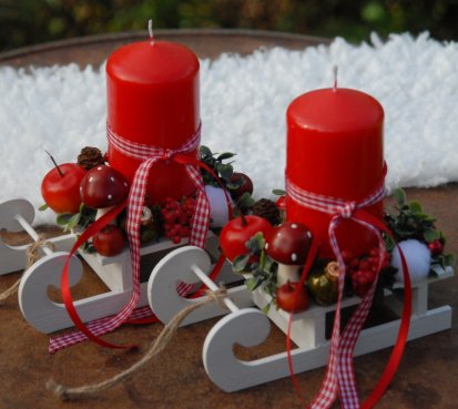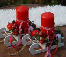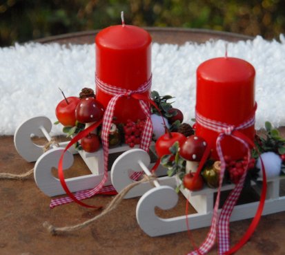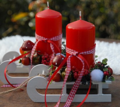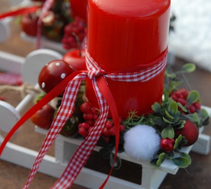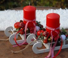 Bohatě zdobené dřevěné sáňky vánočními přízdobami....svíčka na bezpečnostním bodci je vyměnitelná