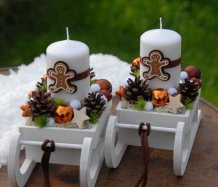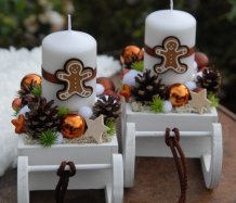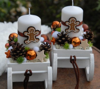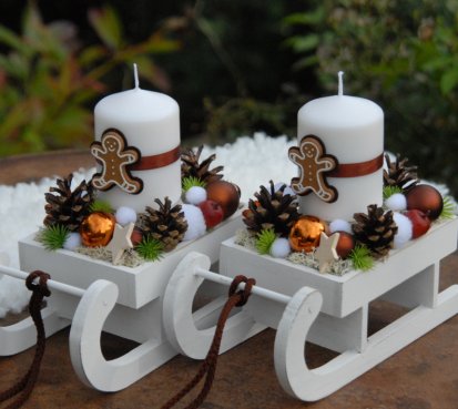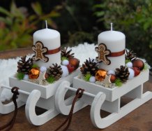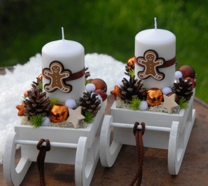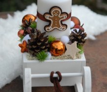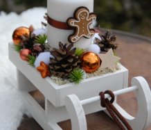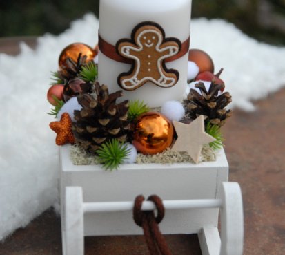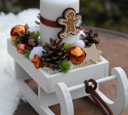 Dřevěné sáňky jsou bohatě nazdobeny vánočními přízdobami...svíčka na bezpečnostním bodci je vyměnitelná