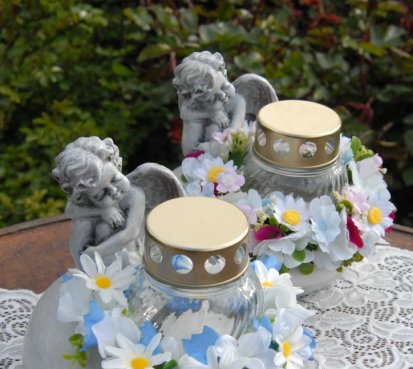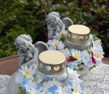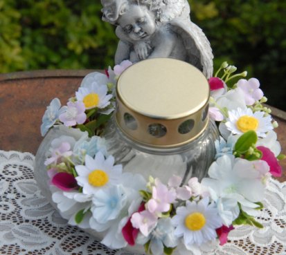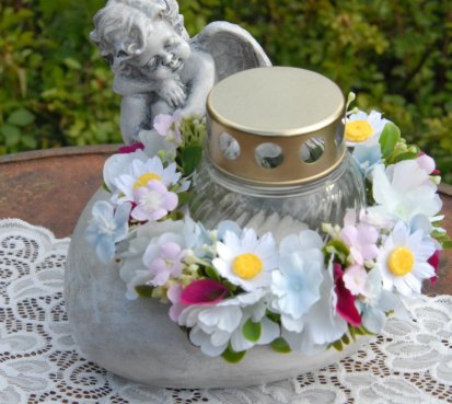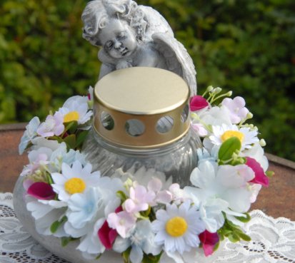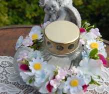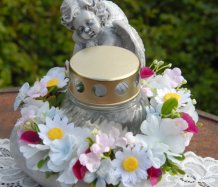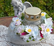 Srdce s andělem je vytvořeno z polyresinu, zdobené dokonalými umělými květinami...skleněný svícen s vyměnitelnou svíčkou