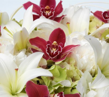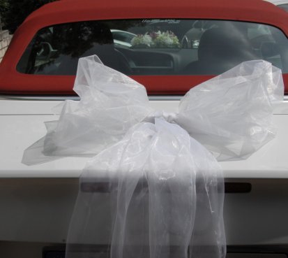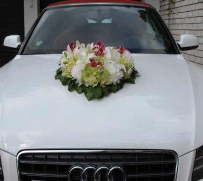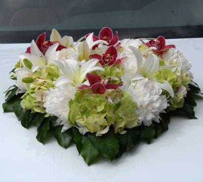 Svatební výzdoba auta pro nevěstu. Výzdoba je vytvořena z čerstvých lilií, hortenzie, pivoněk, orchidejí. K výzdobě též patří mašle z organzy na zadní části auta, která je přidělána na přísavkách.
