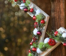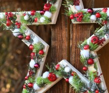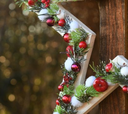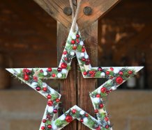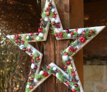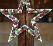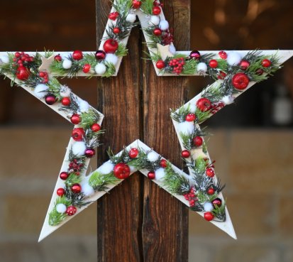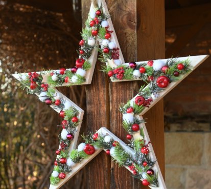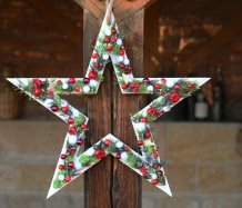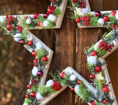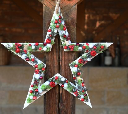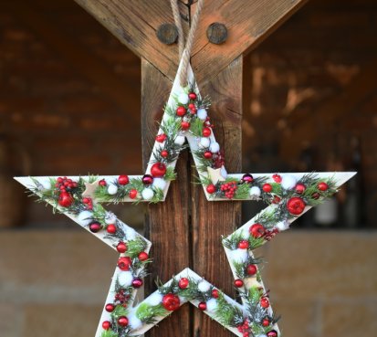 Dřevěná hvězda je bohatě zdobena vánočními přízdobami