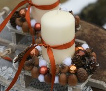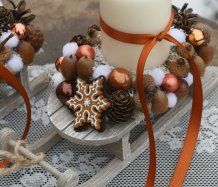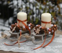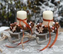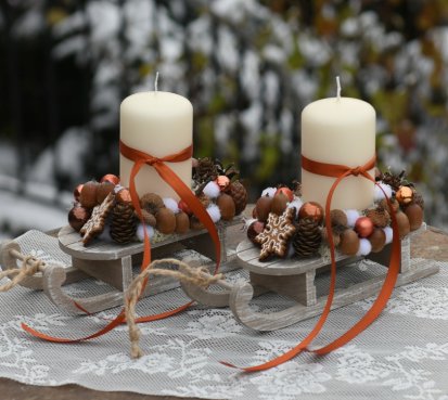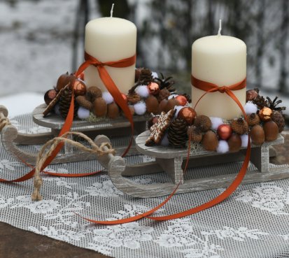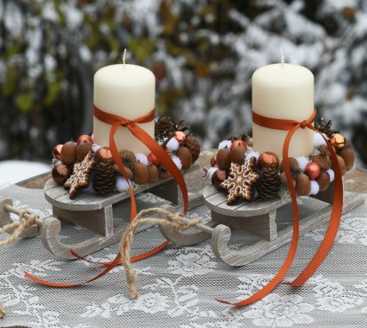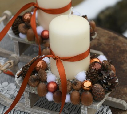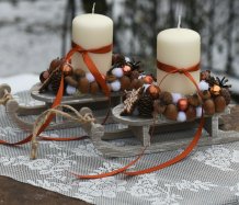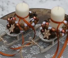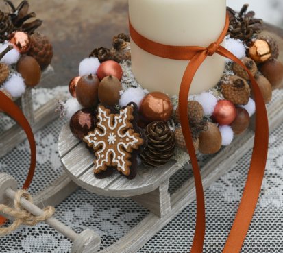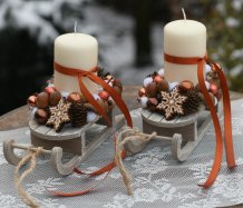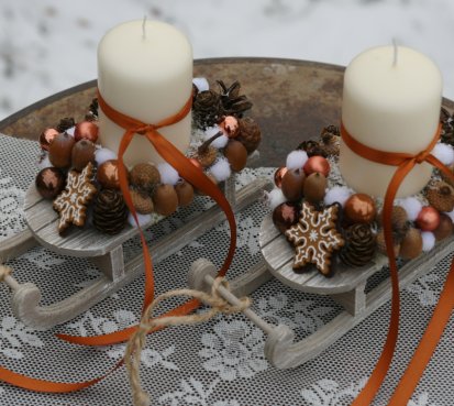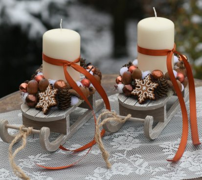 Krásné dřevěné sáňky jsou naaranžovány vánočními přízdobami...svíčka je vyměnitelná na bezpečnostním bodci....krásný perníček je z filcu