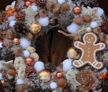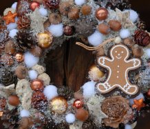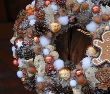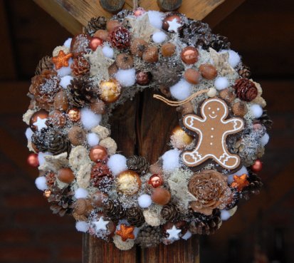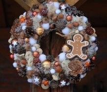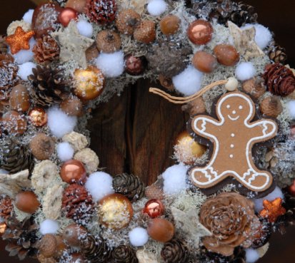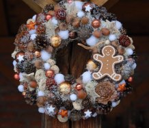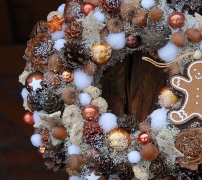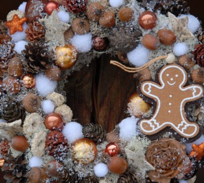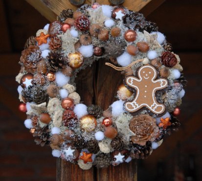 Krásný závěsný věnec je vytvořen na pevném korpusu bohatě zdoben kouličkami a přírodninami....krásný perníček je z filcu