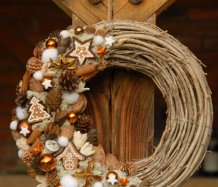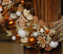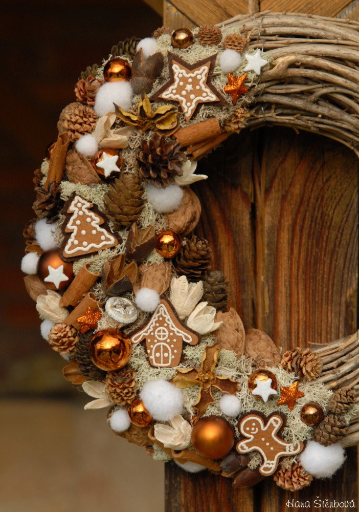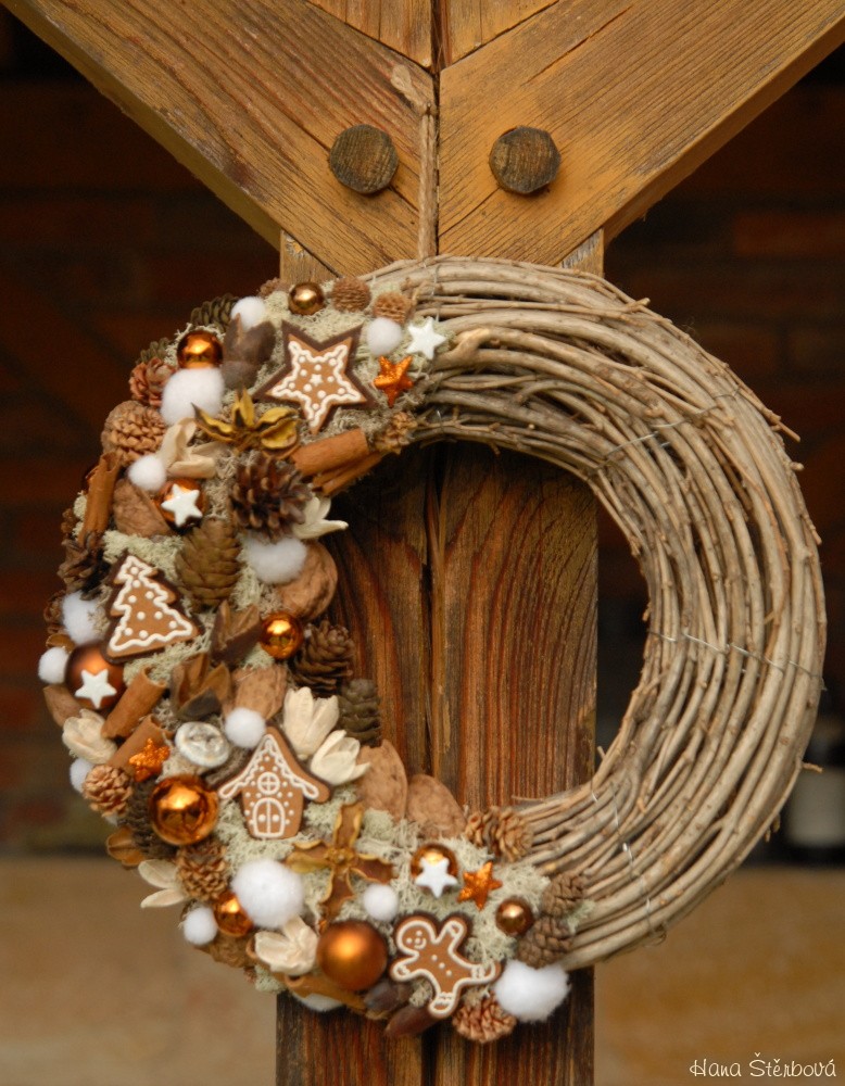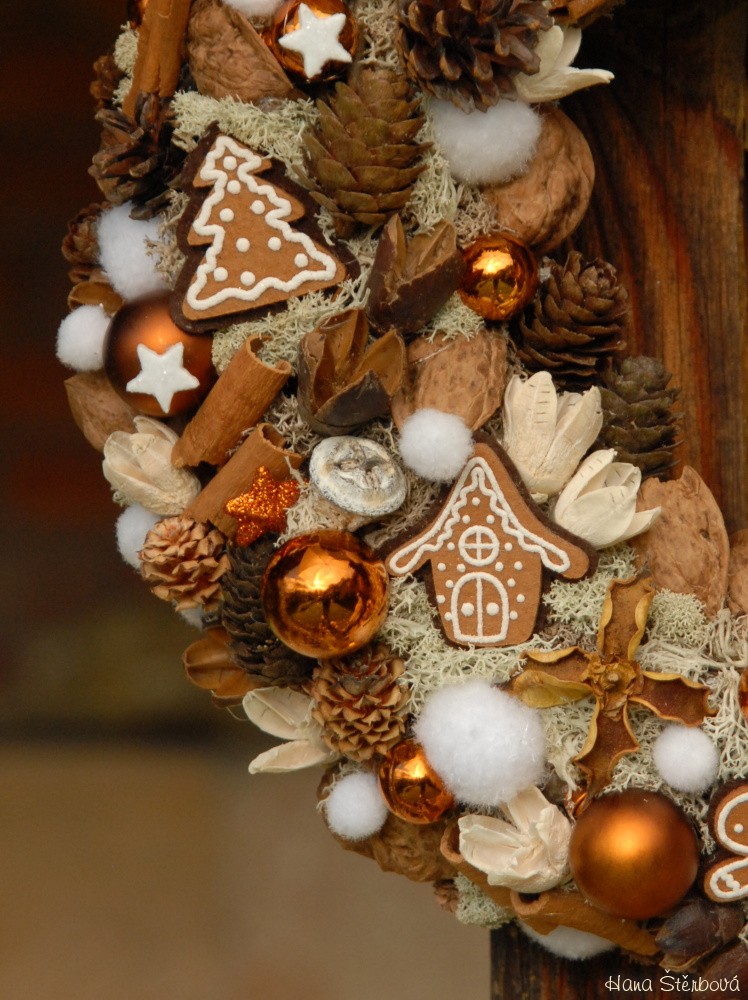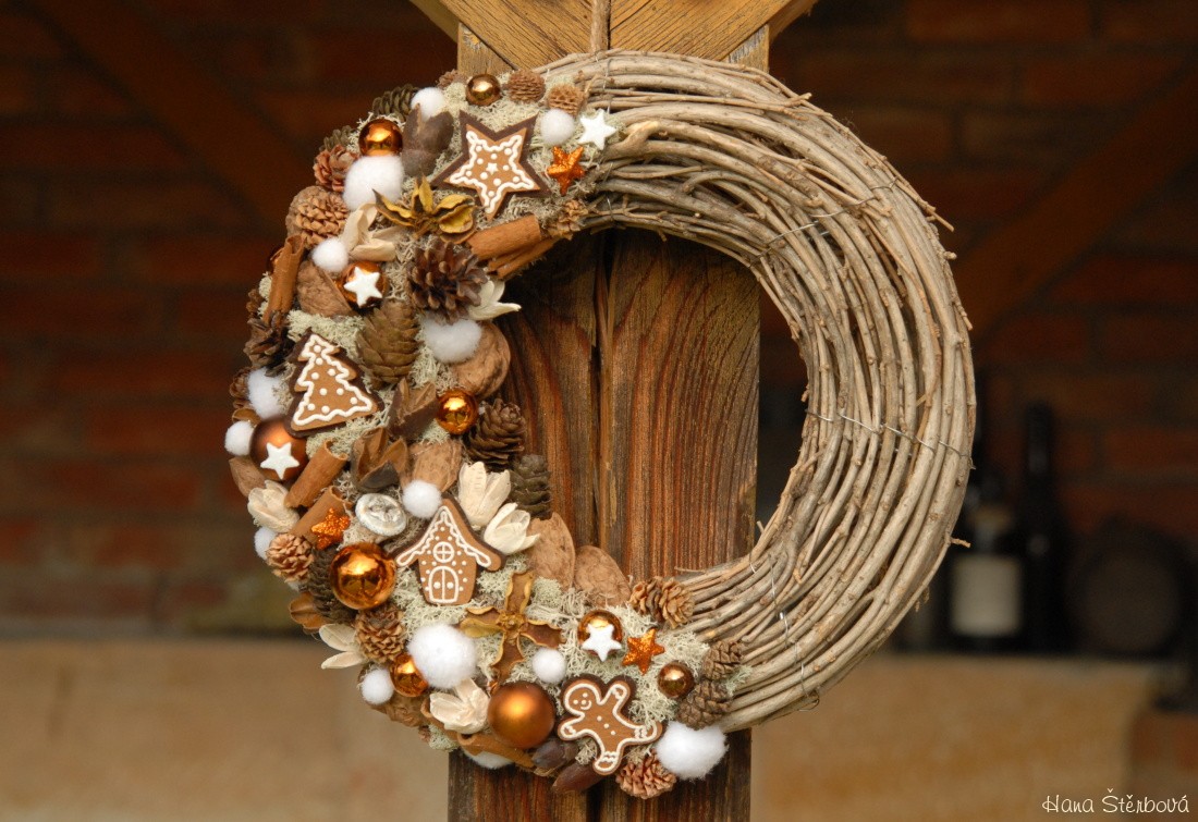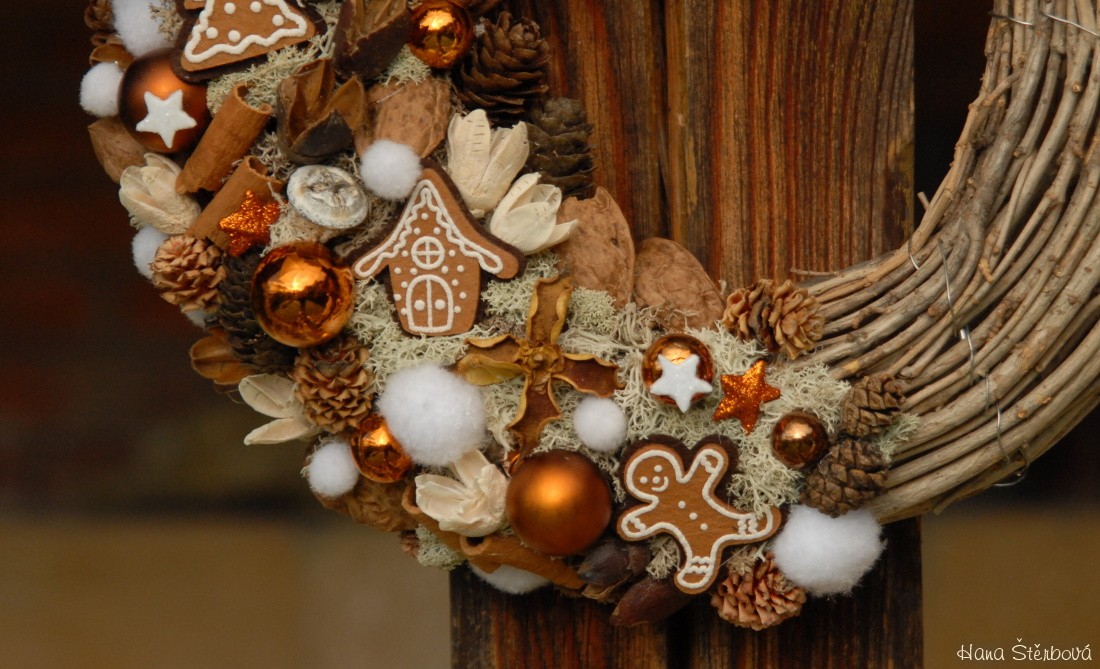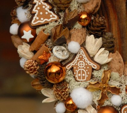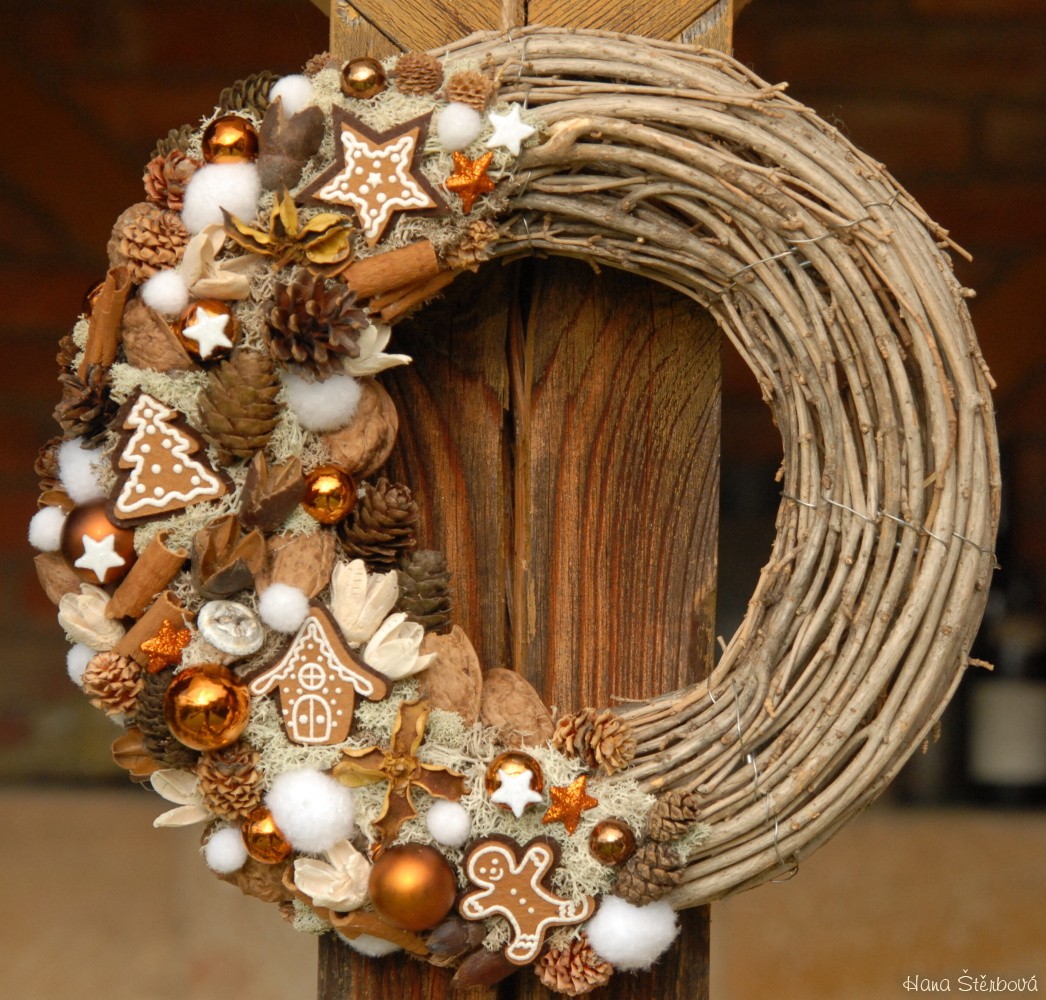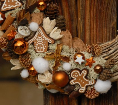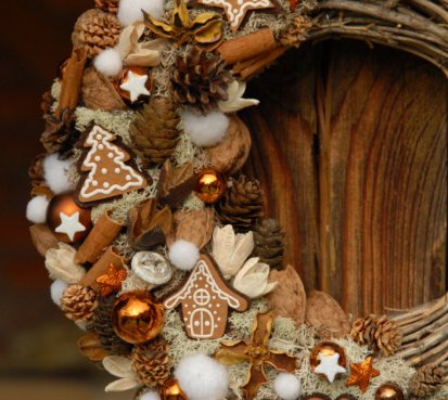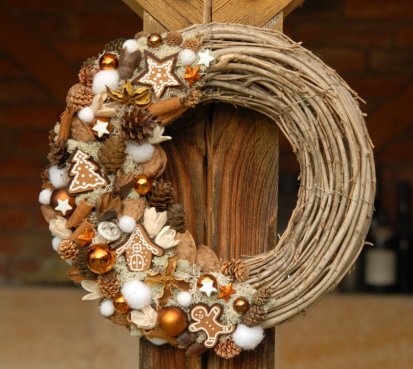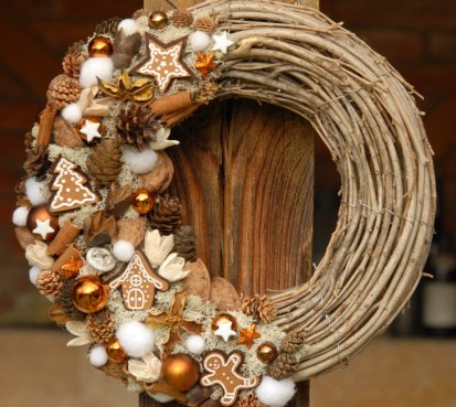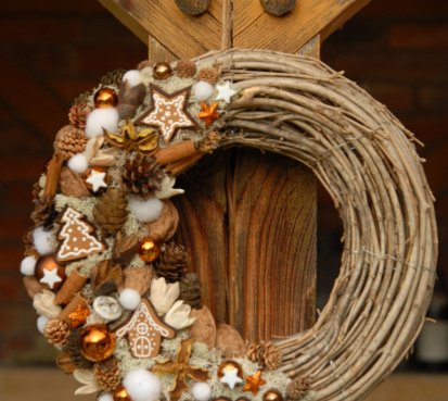 Bohatě zdobený věnec vánočními přízdobami a krásnými perníčky z filcu