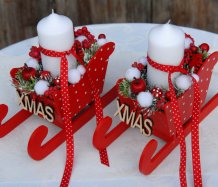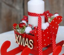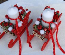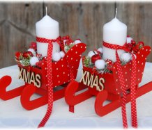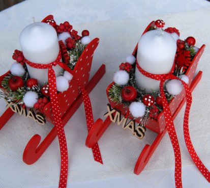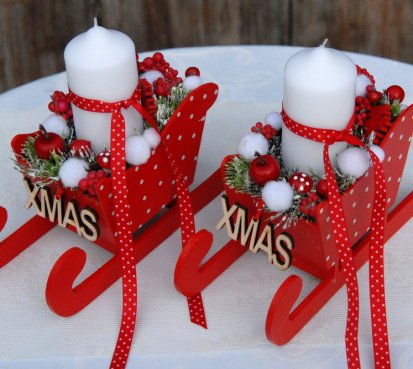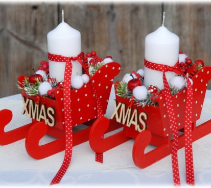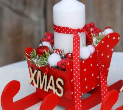 Krásné dřevěné sáňky s vyměnitelnou svíčkou na bezpečnostním bodci jsou bohatě zdobené vánočními přízdobami