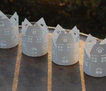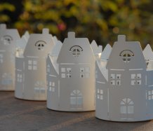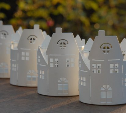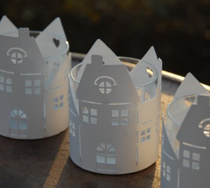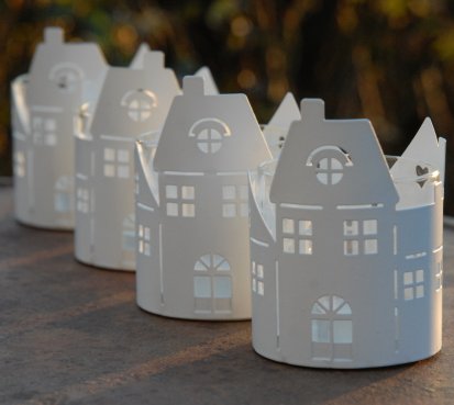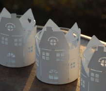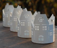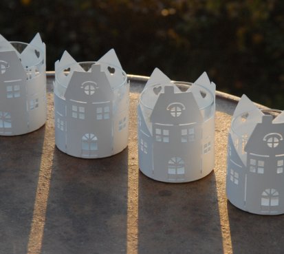 Plechový svícen ve tvaru městečka na čajovou svíčku