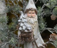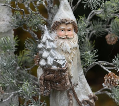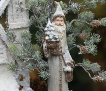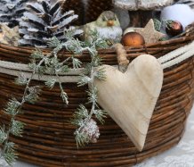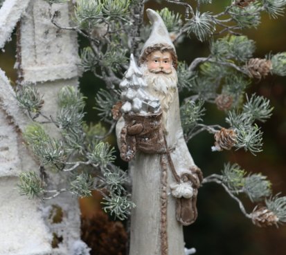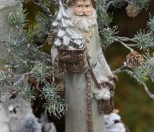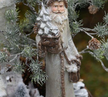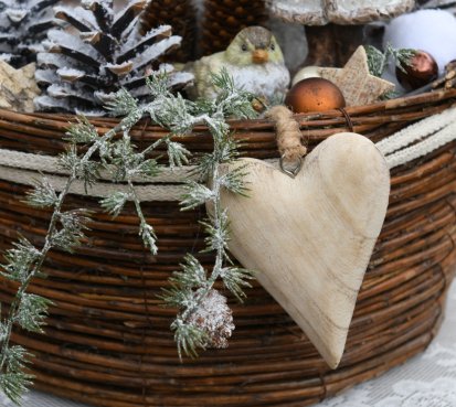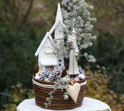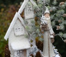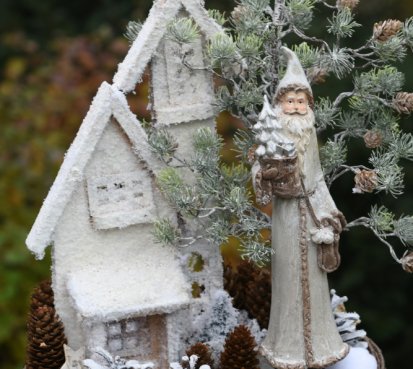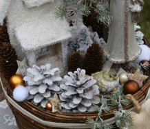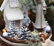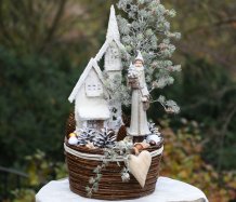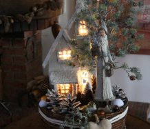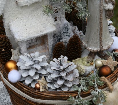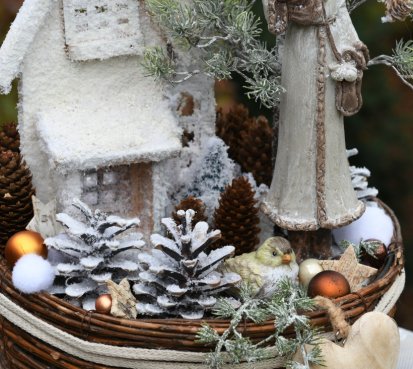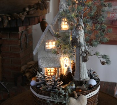 Veliká vánoční dekorace s krásným dřevěným kostelíkem s led světýlky, vánočními přízdobami a přírodninami. Krásný Ježíšek je z polyresinu