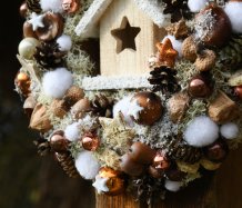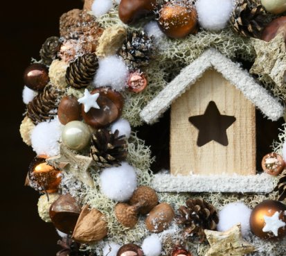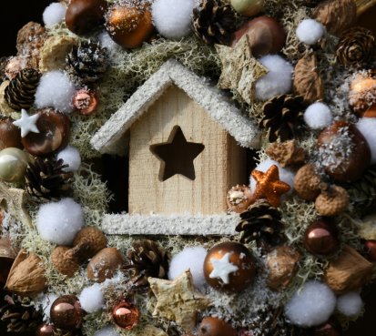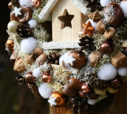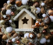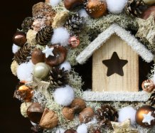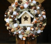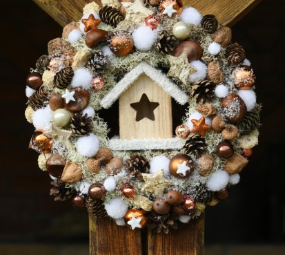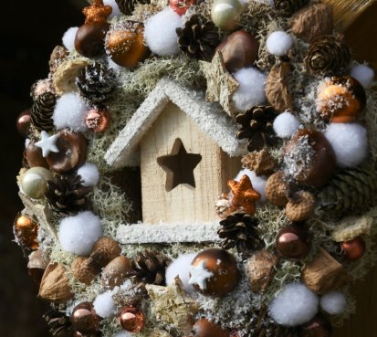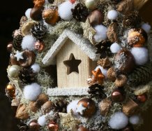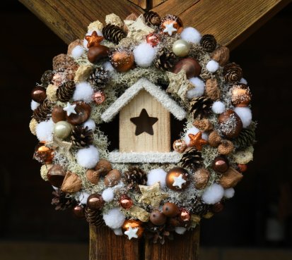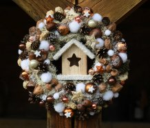 Závěsný věnec je vytvořen na pevném korpusu, bohatě zdoben vánočními přízdobami a přírodninami....a dřevěným domečkem