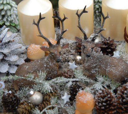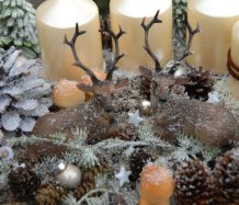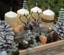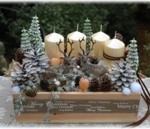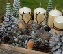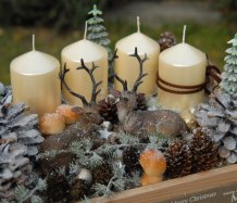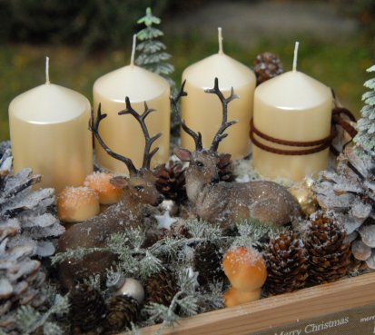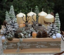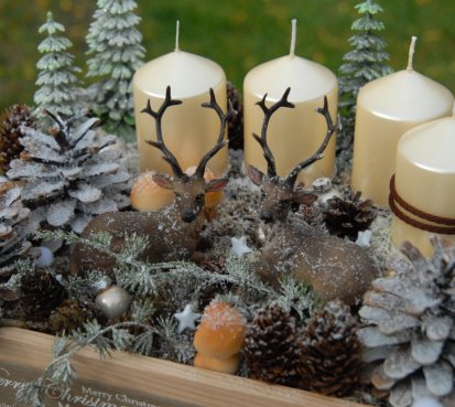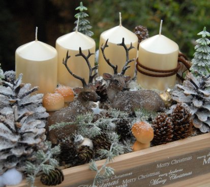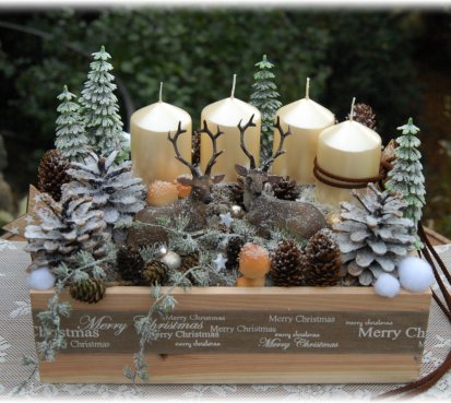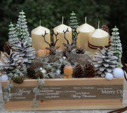 Dekorace je naaranžována do dřevěné bedničky, naplněna krásnými vánočními přízdobami, stromečky, houbičkami, šiškami......svíčky na bezpečnostních bodcích jsou vyměnitelné...na vše dohlíží dva krásní jeleni z polyresinu