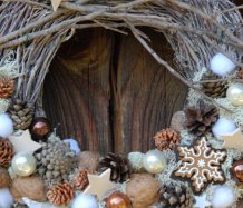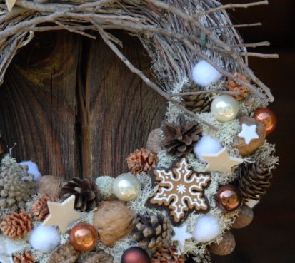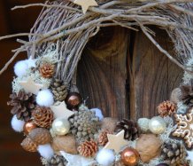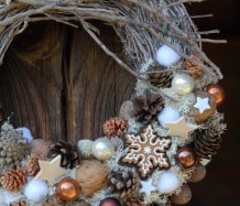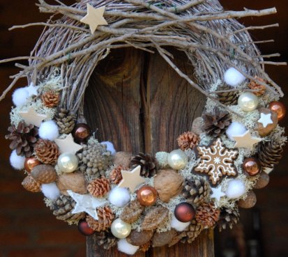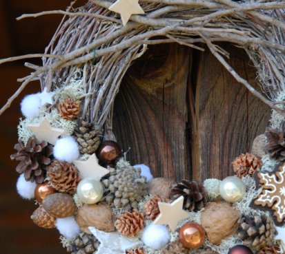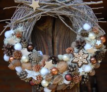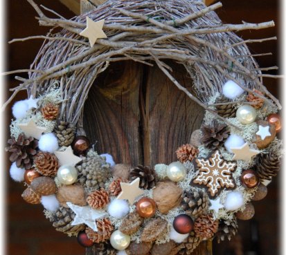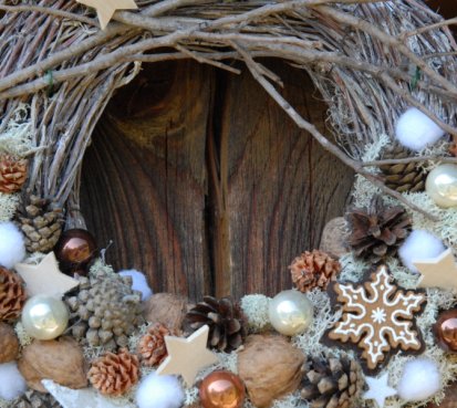 Věnec z jemného proutí je naaranžován spoustou vánočních přízdob a přírodnin