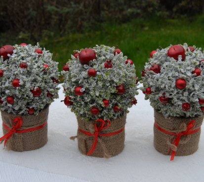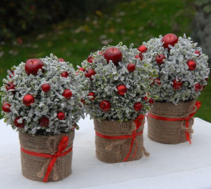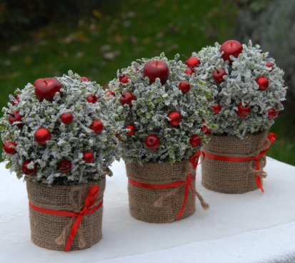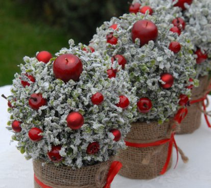Omrzlé zimní stromečky jsou dekorovány červenými jablíčky a kouličkami