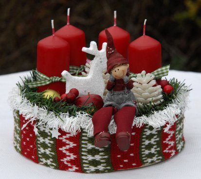 Adventní dekorace se čtyřmi vyměnitelnými svíčkami, v nádobce, která je obalena pleteninou
