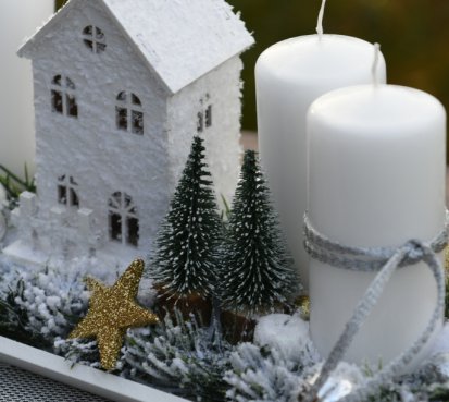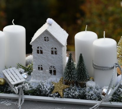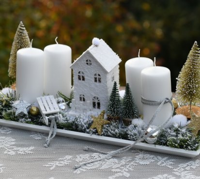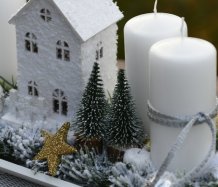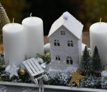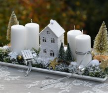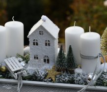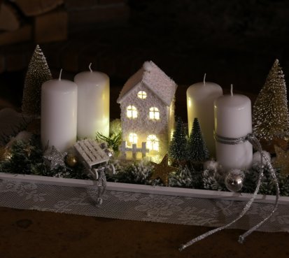 Dekorace je naaranžována na dřevěném tácu, doplněna vánočními přízdobami, svíčky na bezpečnostních bodcích jsou vyměnitelné. Domeček za šera svítí.