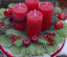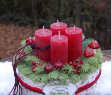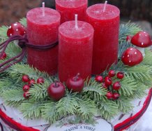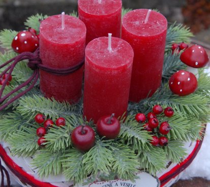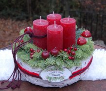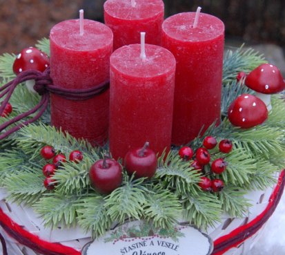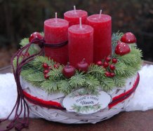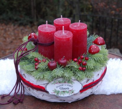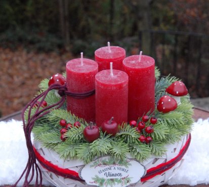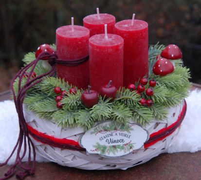 Dekorace je naaranžována v bílém košíku, bohatě zdobena umělým jehličím, vánočními přízdobami....krásné svíčky na bezpečnostních bodcích jsou vyměnitelné
