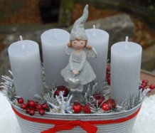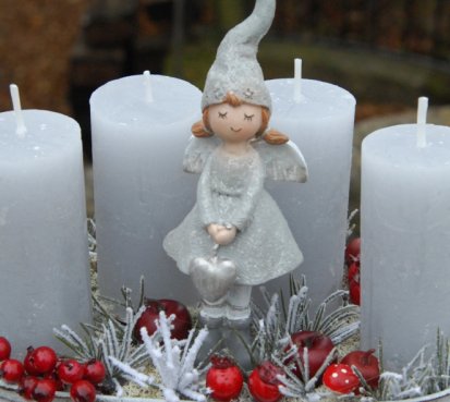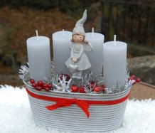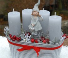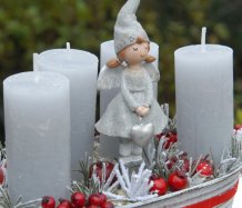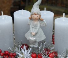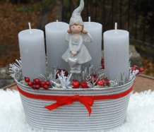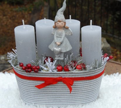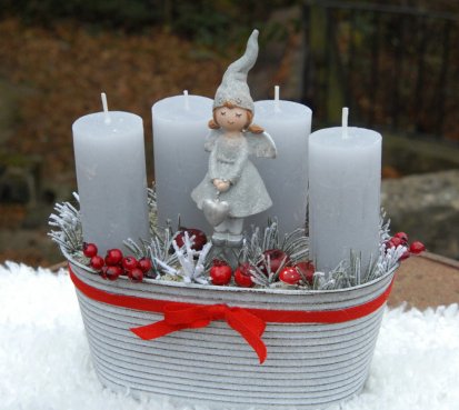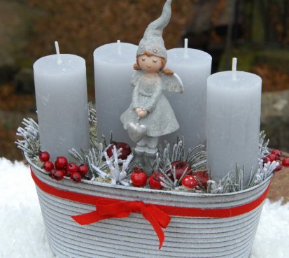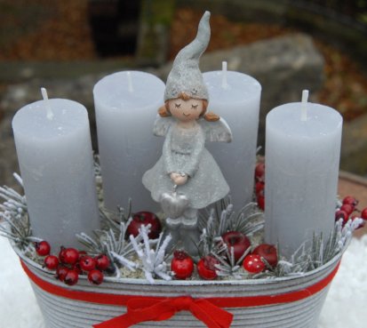 Andělka je naaranžována do krásné plechové nádobky s vyměnitelnými svíčkami na bezpečnostních bodcích